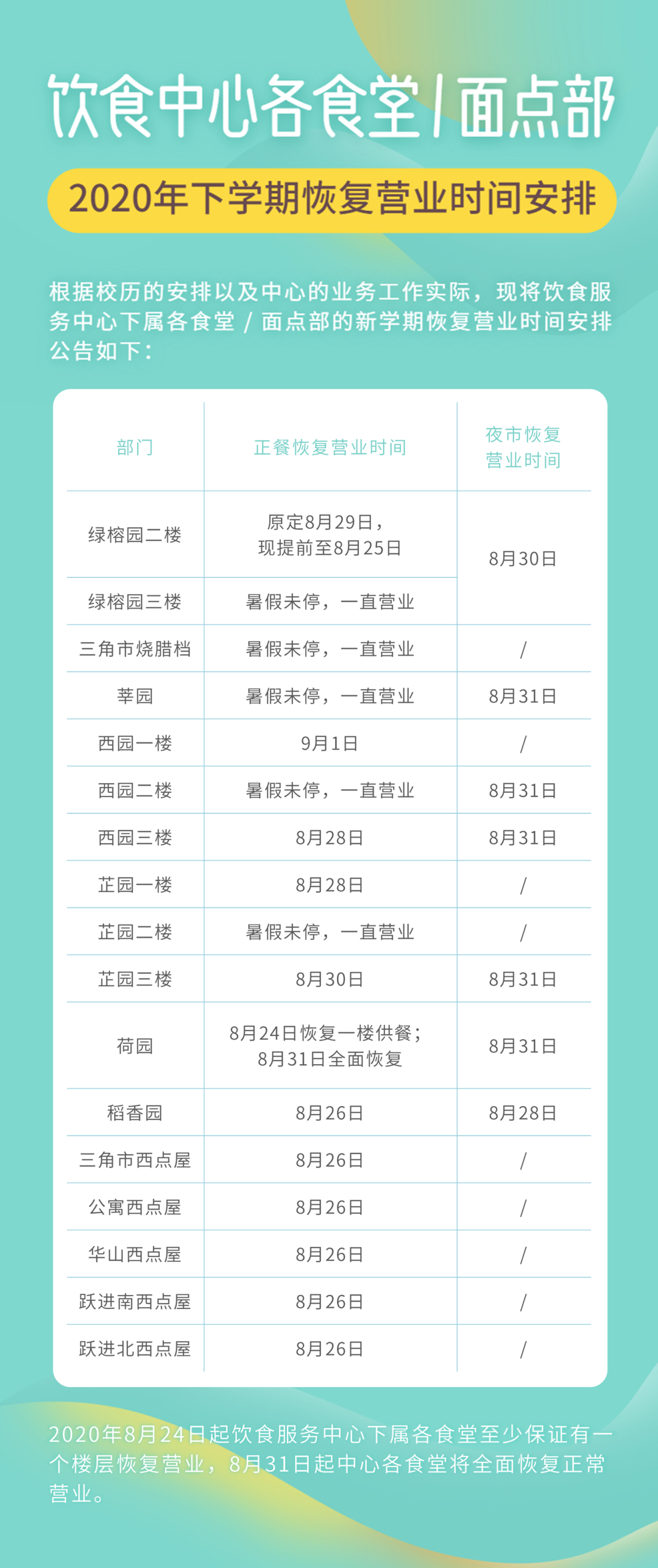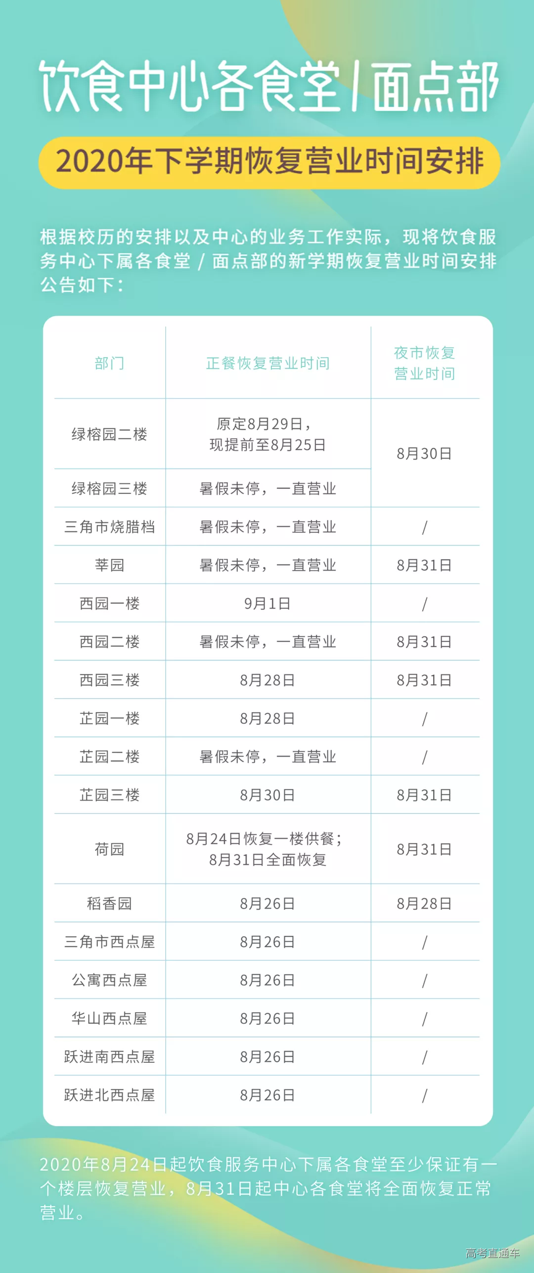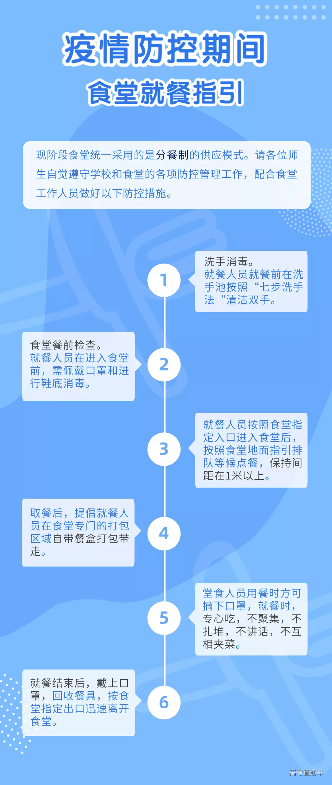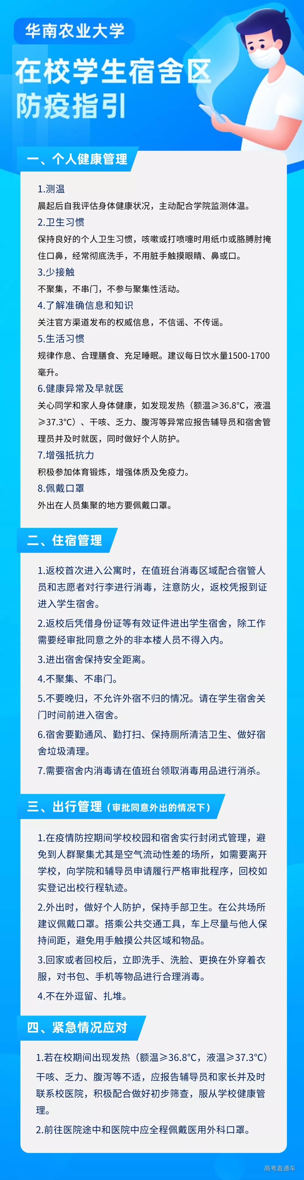 问:学生什么时候可以返校? 答:按照新学期教学安排,定于8月27日起分8期组织学生错时错峰完成返校,具体安排将由各学院通知学生本人。 问:什么情况下学生暂不返校? 答:出现以下情况之一者,暂不返校。 (1)诊断为新冠肺炎病例或疑似病例或无症状感染者的学生。 (2)申请返校时还在国内中高风险地区,或返校前14天内仍滞留在国内中高风险地区的学生。 (3)申请返校时还在国(境)外,或返校前14天内有境外旅居史的学生。 问:申请返校需要哪些流程? 答:学生返校实行申报审批制度,已接到返校通知的学生按要求在学校紫荆e站网办大厅“学生返校申请”流程中申报。各学院进行审核,获准返校学生方能按期返校。 问:无法按学校规定时间返校,可以申请延后或者提前返校吗? 答:如确因特殊情况无法在规定时间内返校的,需申请延后或者提前返校的,需提前联系辅导员告知情况。 问:返校旅途中需要注意哪些问题? 答:在返校途中,要做好个人防护;需搭乘公共交通的,应尽量选择直达交通工具,减少换乘,尽量分散就座,与他人保持一定的距离,途中应全程佩戴口罩;要保留好车票、飞机票等凭证,自驾车出行的要做好车内清洁消毒工作;出发前或途中出现发热、咳嗽等症状,要及时就诊,同时向学院报告,推迟到校时间。 问:学生返校可以从哪个校门进入学校? 答:开放西南门、牌坊门、汇景北门、思创园正门、西门共5个学生返校入口。学校实行学生进校分流,居住在泰山区的学生从汇景北门或牌坊门进校;居住在启林南和启林北区的学生从思创园正门进校(原计划是教五广场门,现已调整);居住在华山区的学生从学校西门或西南门进校;居住在燕山区的学生从西南门或牌坊门进校,特殊情况由学院另行通知。值得注意的是,因学校承接2020年全国会计专业技术资格考试, 8月29-30日、9月5日三天开放汇景北门作为考试专用出入口。原计划上述三日从汇景北门入校的学生调整到从茶山牌坊门入校。 问:学生返校期间,各个校门的开放时间是怎么安排的? 答:学生返校日8:00-18:00开放西南门、牌坊门、汇景北门、思创园正门、西门等5个学生返校入口;18:00-21:00只开放西南门、思创园正门、汇景北门;21:00后,西南门、思创园正门、西门外门可入校,属于当天返校学生,保安测温检查无异常后予以入校。非返校日学生返校,由学院根据返校程序,安排老师接学生入校。 问:私家车可以进入校园吗?家长上能宿舍吗? 答:允许家长开私家车送学生进入校园,但随车人员不得超过2人,学生走返校通道进入校园,随车人员需查验粤康码并测量体温后方能进入校园。根据学校划定的区域和行驶路线,送达学生到指定区域后,即停即走,家长禁止进入学生宿舍。 问:学生返校报到有哪些基本流程? 答:学生返校报到“八步法”(“一测二查三打四换五进六报七消八入”),即测量体温、查验粤康码、打卡学生识别系统、换口罩、进入校园、学院报到点报到、公寓入口处行李消杀、凭《报到证明》进入个人宿舍。 问:校门口有校巴接送我们回宿舍区吗? 答:(1)校内穿梭校巴:1号线8月28日恢复运营。2号线暂停。1号线线路为:荷园←→公寓东←→五山公寓←→教四←→新牌楼←→湿地公园←→三角市←→艺术学院←→教三←→华山活动中心←→工程学院←→西园。 (2)返校交通专列:为学生返校后提供便利,学校开通自西南门(地铁口)出发至各学生宿舍的交通专列。线路如下: 编号1:西南门-华山活动中心-工程学院-西南门 编号2:西南门-茶山牌坊-教四-泰山公寓东-荷园-西南门 编号3:西南门-茶山牌坊-燕山学生公寓 编号4:西南门-茶山牌坊-教四(泰山学生公寓) 注:可使用微信支付、现金乘车,注意秩序,排队上车。 问:在哪里申领粤康码和校园码? 答:学生返校进入校园前需查验粤康码和校园码,具体申领指引见下图。 问:返校后学生进出校园需要审批吗?外出实习、做实验怎么办? 答:根据上级最新文件精神,目前校园实行相对封闭管理,严格审批学生进出校门,建议学生尽量减少出校。对于因外出实习、做实验、住校外等原因需要经常出入校园的学生,由学生本人提出、学院审批,将统一办理临时出入证,详细办理须知将稍后发布。其他临时性的特殊情况需要外出,须通过网办大厅申请,经学院批准后方可外出。 问:返校当天是否可以离校后再返校? 答:返校当天只有1次进校机会,无特殊情况不得离开校园。 问:在校园内需要佩戴口罩吗? 答:学生返校后在校园内应坚持佩戴一周时间的口罩,此后学生出入教学楼、饭堂、图书馆、实验室、超市、菜市场等人员密集场所仍需佩戴口罩。请返校前自备一周使用的口罩数量。 问:疫情防控期间食堂就餐有哪些要求? 答:现阶段食堂统一采用的是分餐制的供应模式。建议无课或早下课的学生,提早前往食堂打饭,错峰用餐,避免扎堆聚集。就餐人员就餐前在洗手池按照“七步洗手法”清洁双手。进入食堂前,需佩戴口罩和进行鞋底消毒。按照食堂指定入口进入食堂后,按照食堂地面指引排队等候点餐,保持间距在1米以上。取餐后,提倡就餐人员在食堂专门的打包区域自带餐盒打包带走。堂食人员用餐时方可摘下口罩,就餐时,专心吃,不聚集,不扎堆,不讲话,不互相夹菜。就餐结束后,戴上口罩,回收餐具,按食堂指定出口迅速离开食堂。