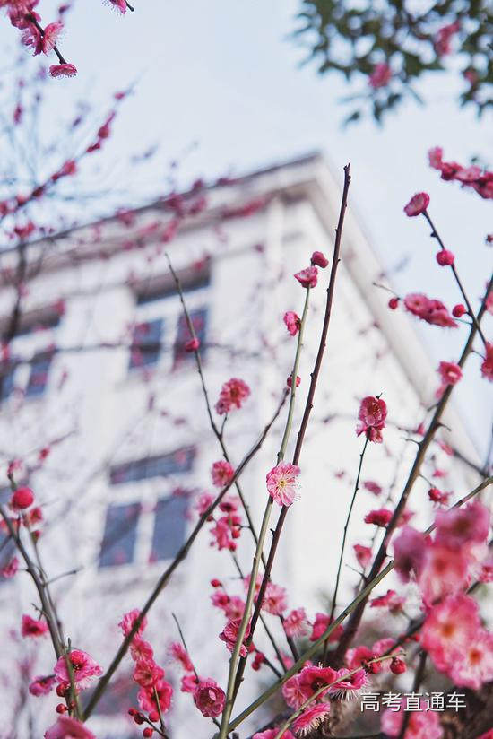 四教的梅林,梅花开的正盛,粉色的小花连成一片,低调而又绚烂。刘佳欣/摄
