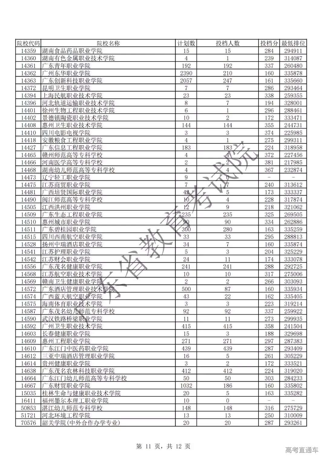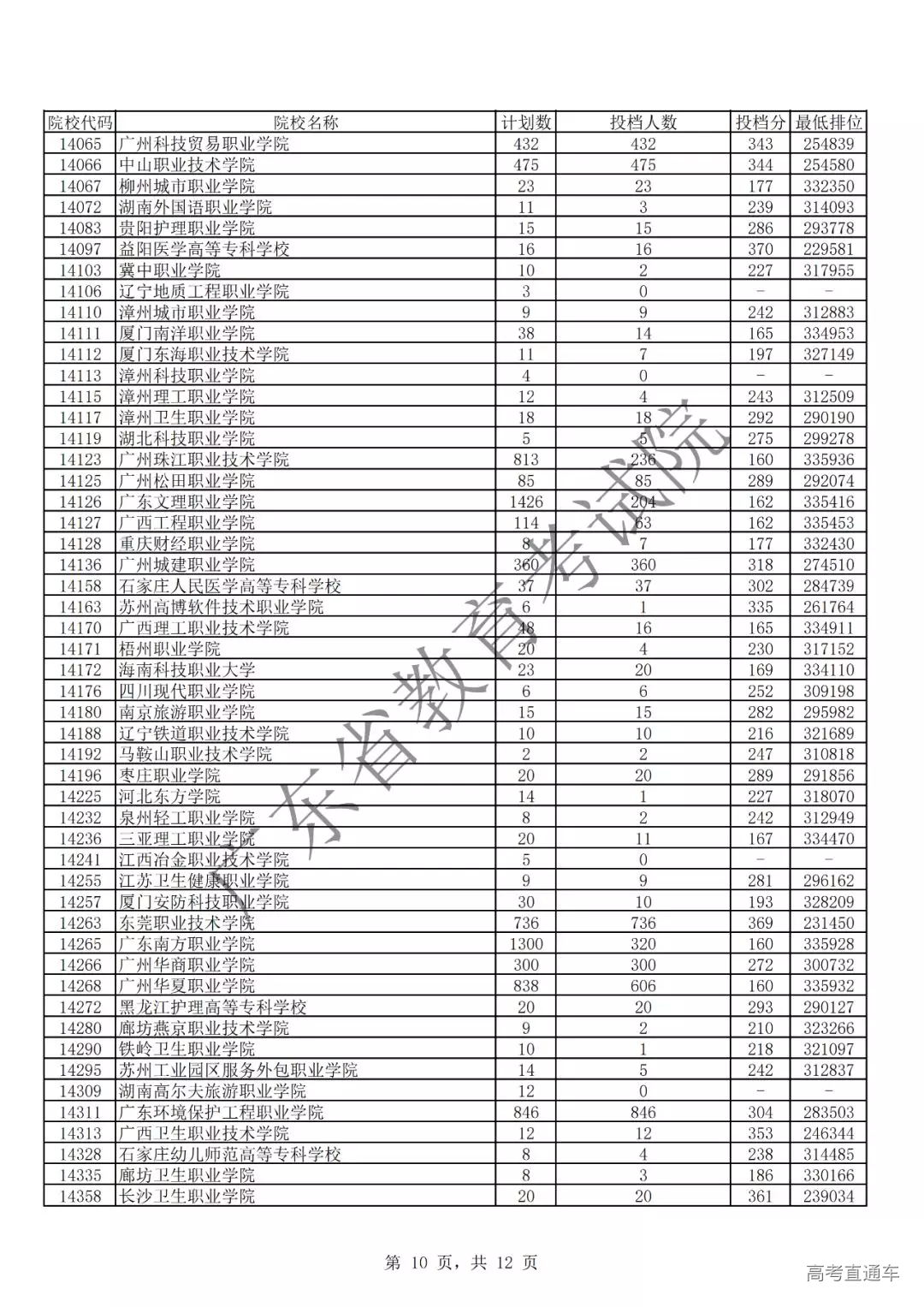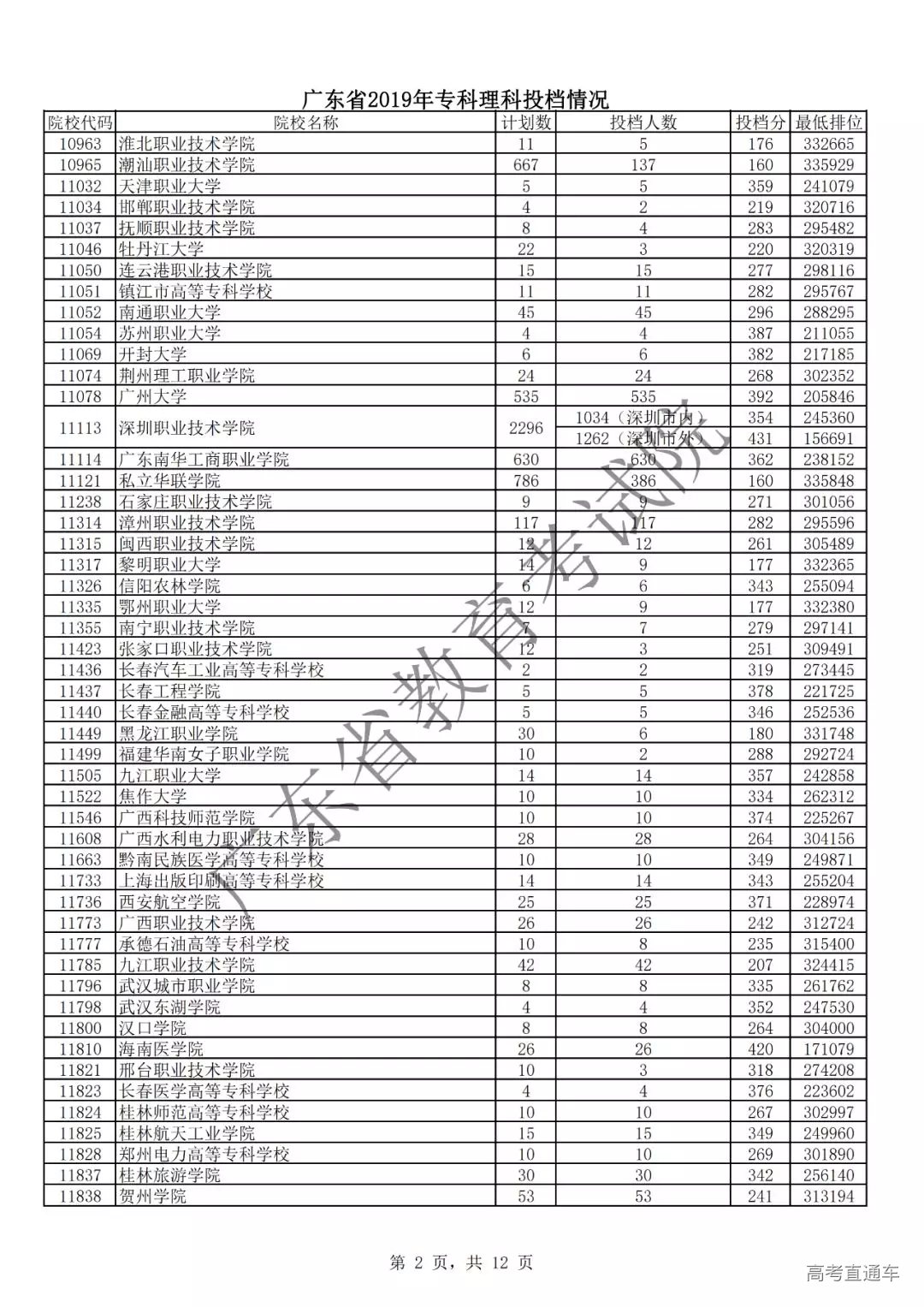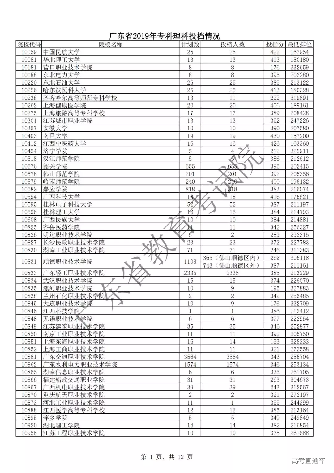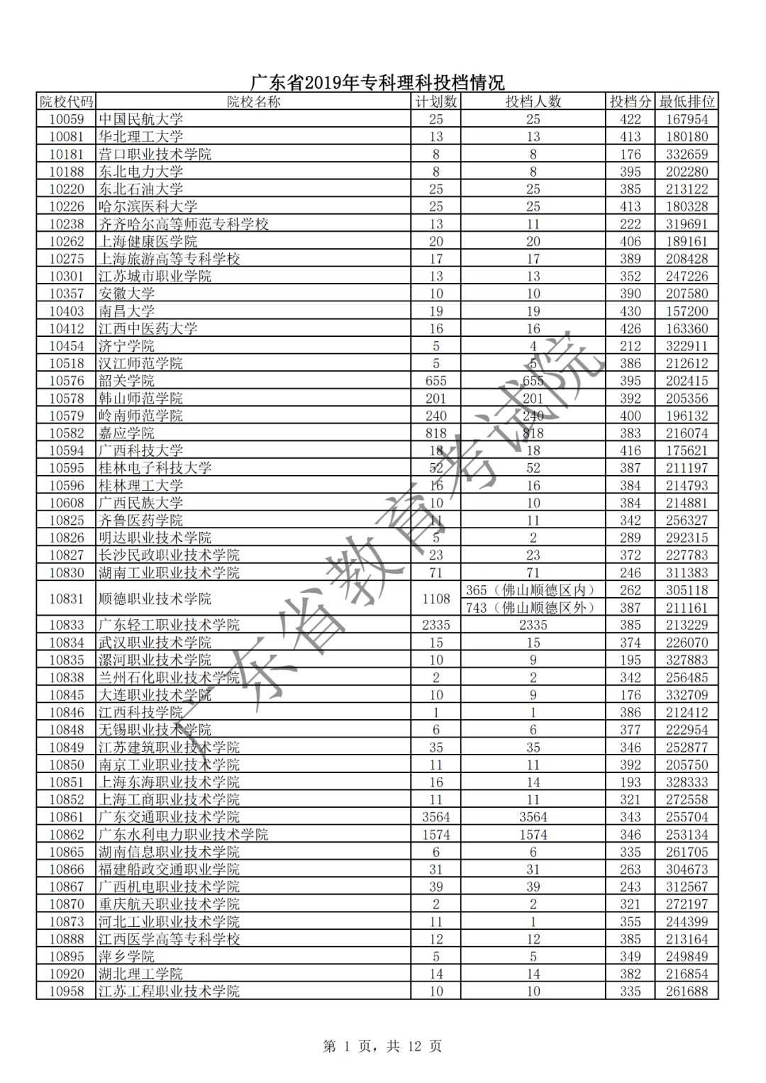 广东省2019年专科理科投档情况