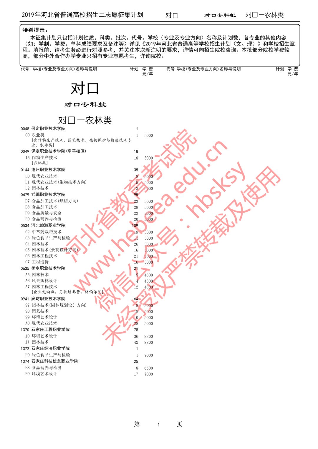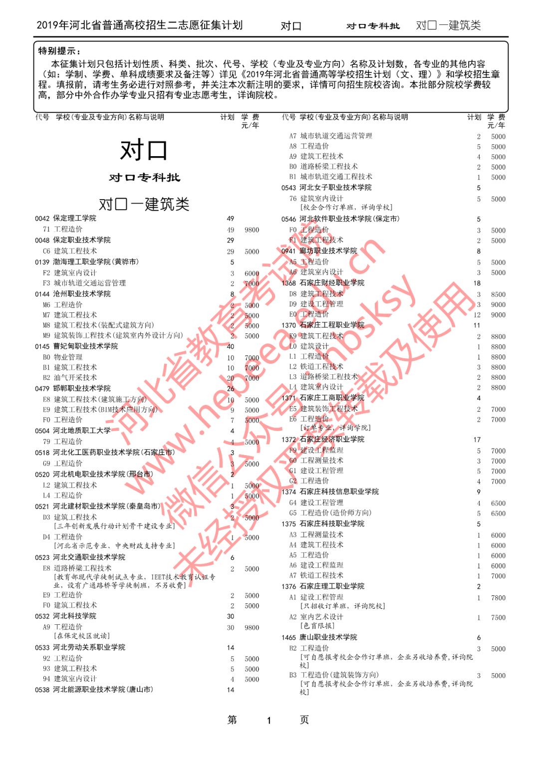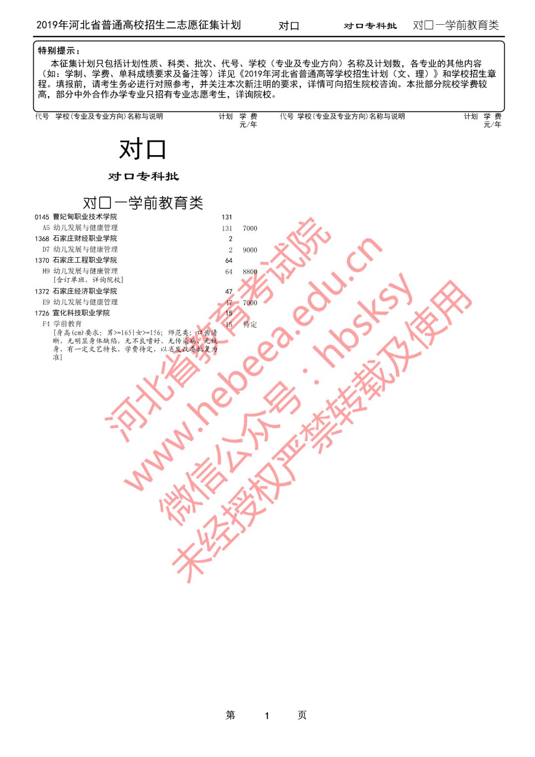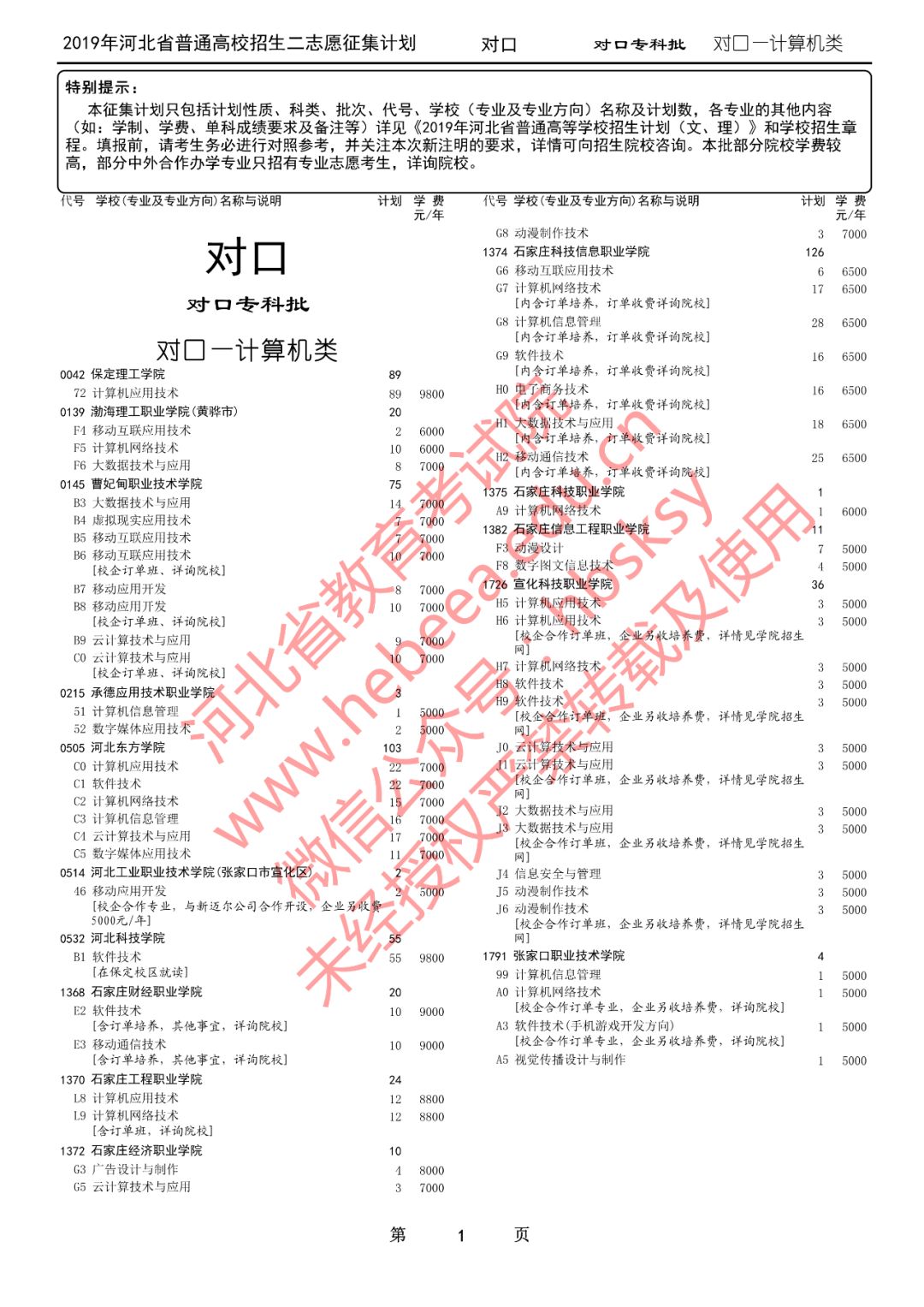 特别提醒:本征集计划只包括计划性质、科类、批次、代号、学校(专业及专业方向)名称及计划数,各专业的其他内容(如:学制、学费、单科成绩要求及备注等)详见《2019年河北省普通高等学校招生计划(文、理)》和学校招生章程。填报前,请考生务必进行对照参考,并关注本次新注明的要求,详情可向招生院校咨询。