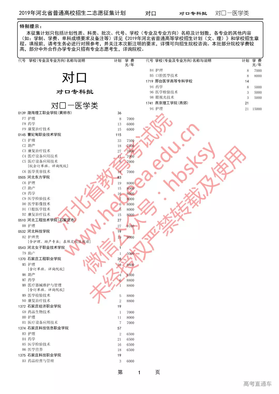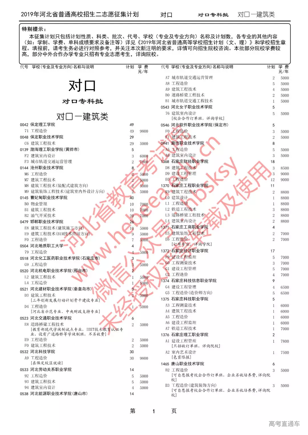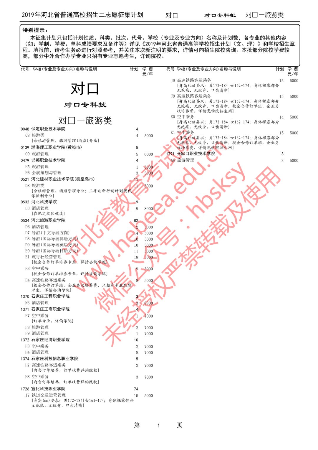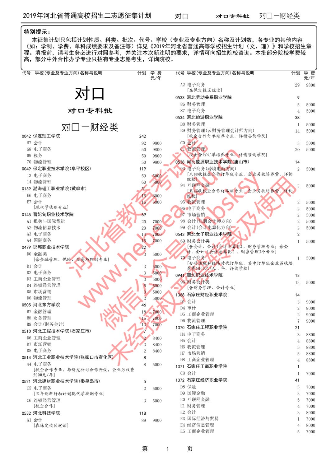 特别提醒:本征集计划只包括计划性质、科类、批次、代号、学校(专业及专业方向)名称及计划数,各专业的其他内容(如:学制、学费、单科成绩要求及备注等)详见《2019年河北省普通高等学校招生计划(文、理)》和学校招生章程。填报前,请考生务必进行对照参考,并关注本次新注明的要求,详情可向招生院校咨询。