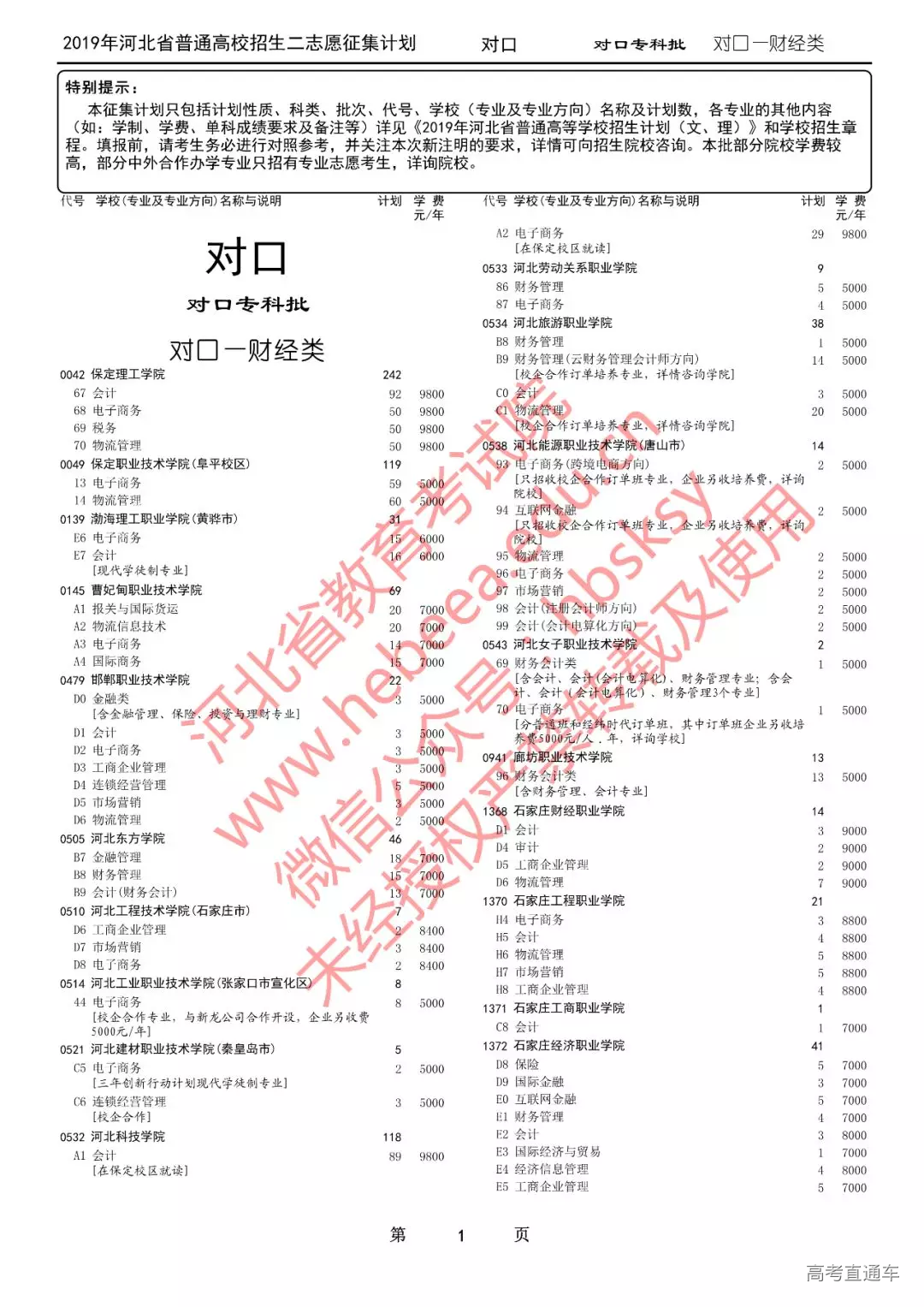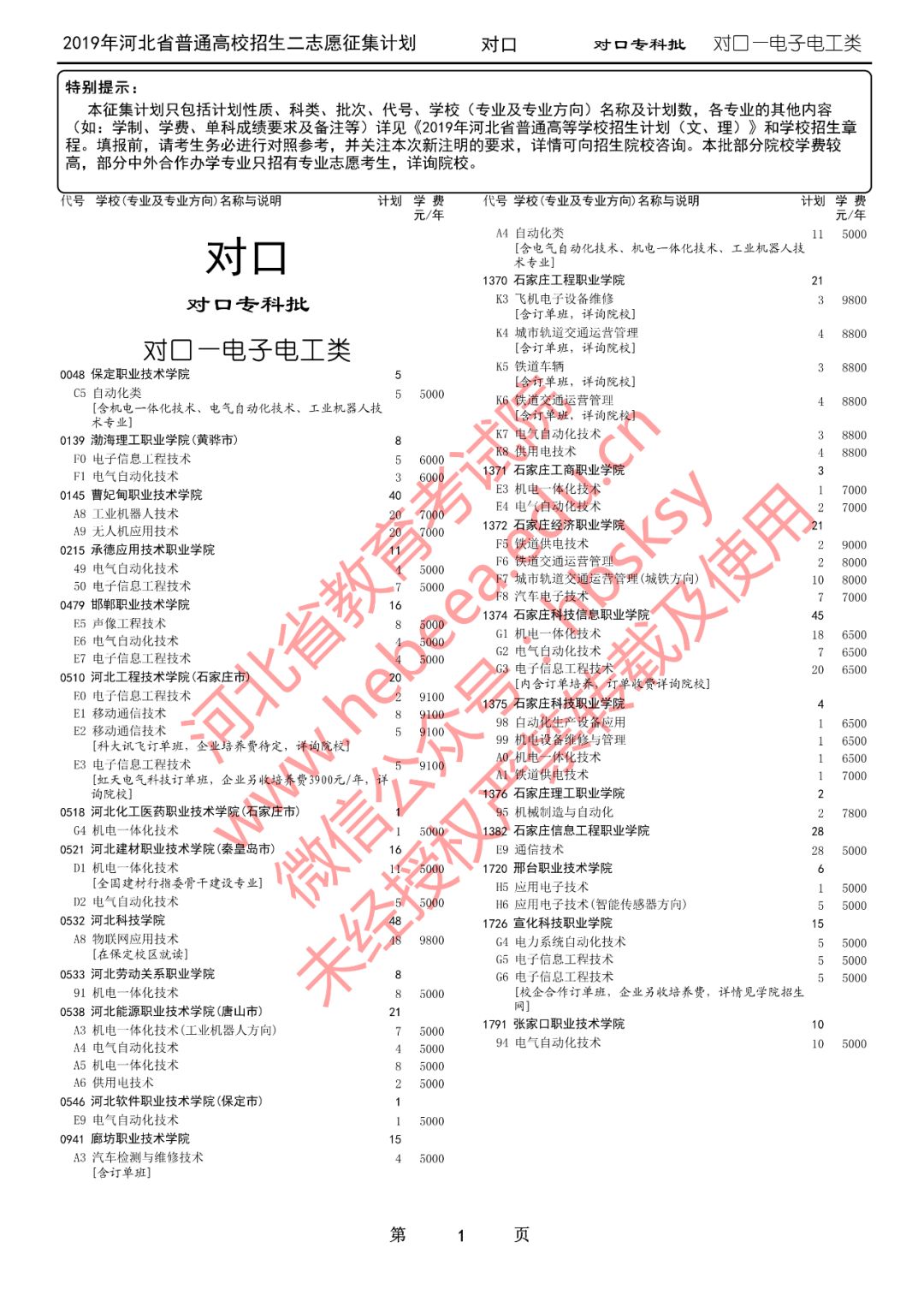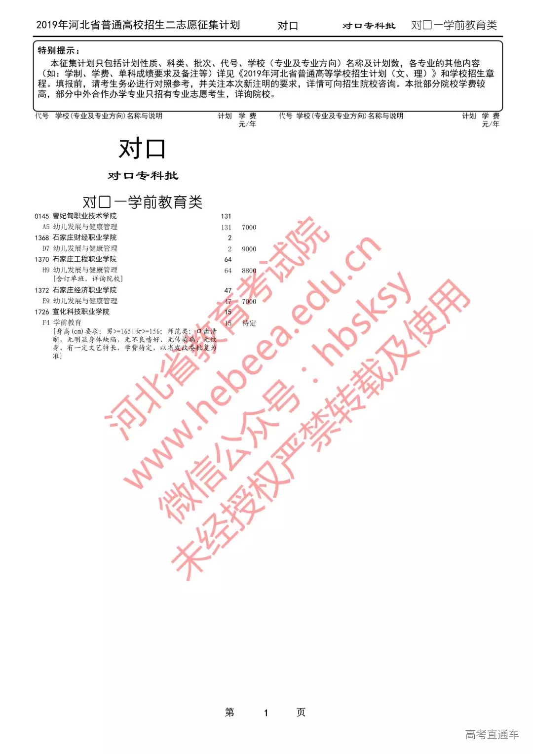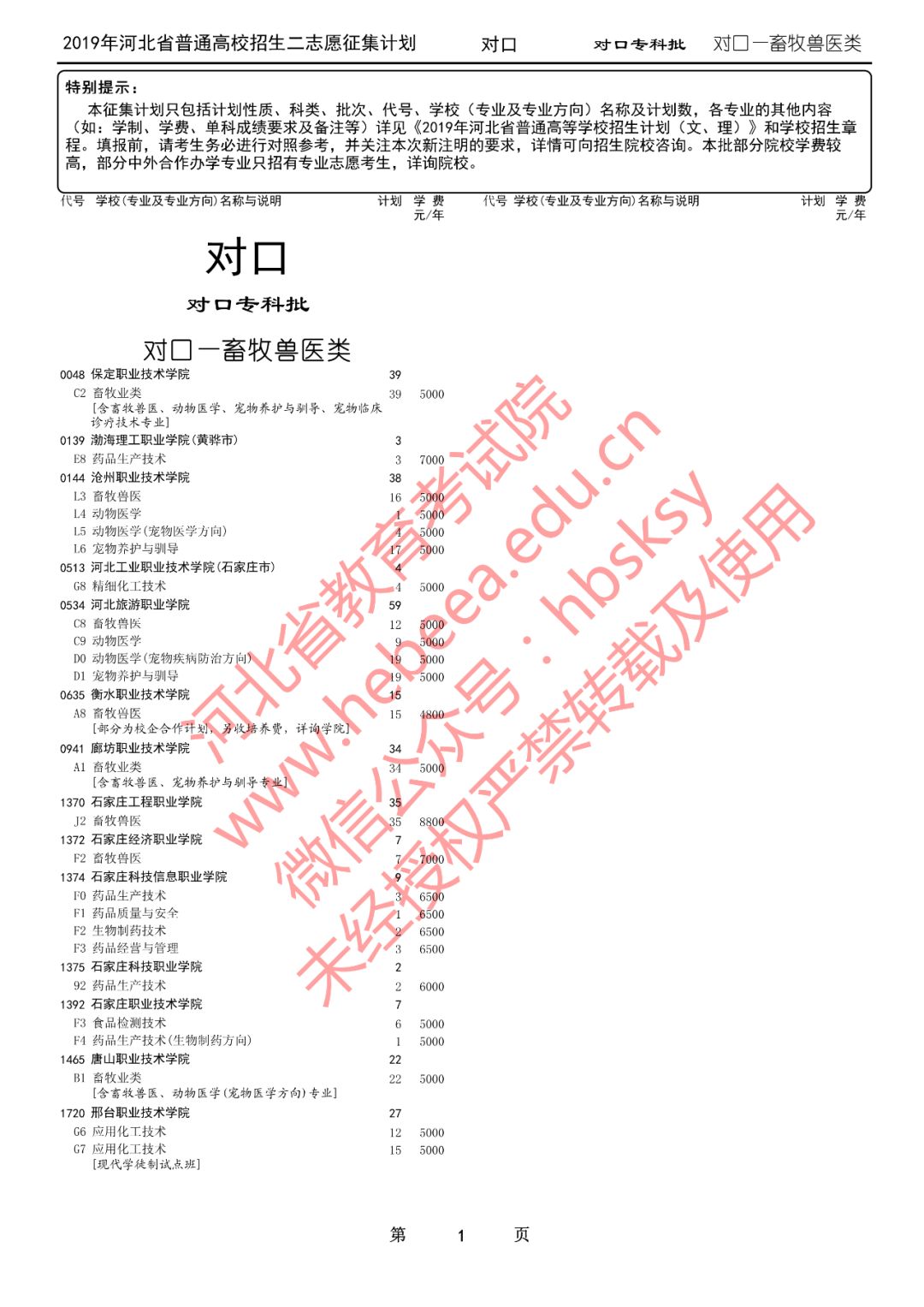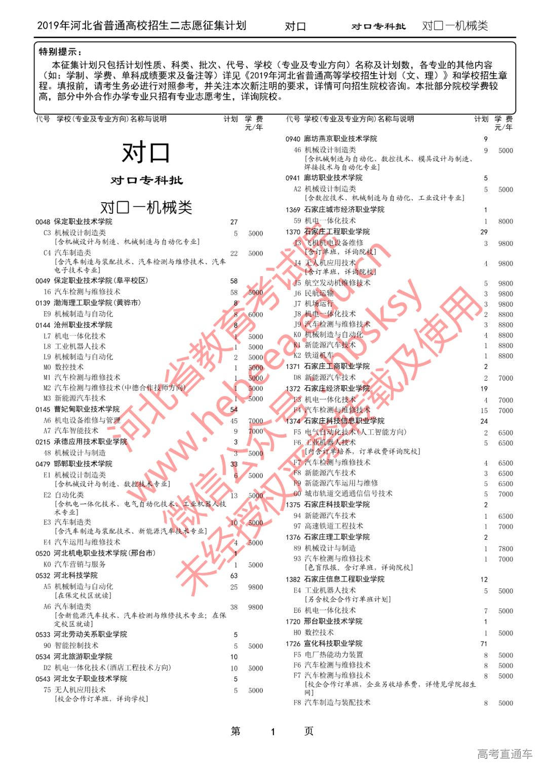 特别提醒:本征集计划只包括计划性质、科类、批次、代号、学校(专业及专业方向)名称及计划数,各专业的其他内容(如:学制、学费、单科成绩要求及备注等)详见《2019年河北省普通高等学校招生计划(文、理)》和学校招生章程。填报前,请考生务必进行对照参考,并关注本次新注明的要求,详情可向招生院校咨询。