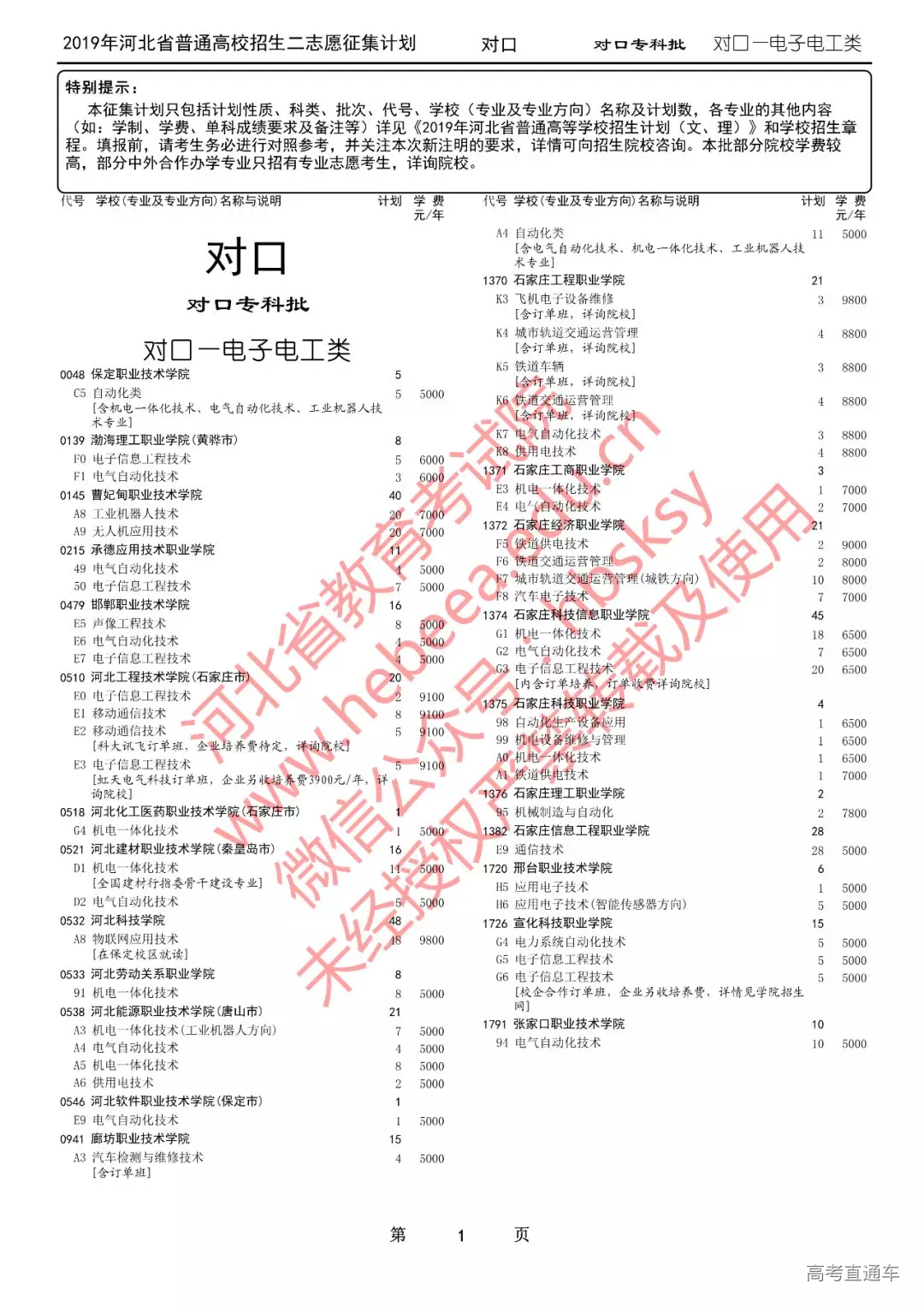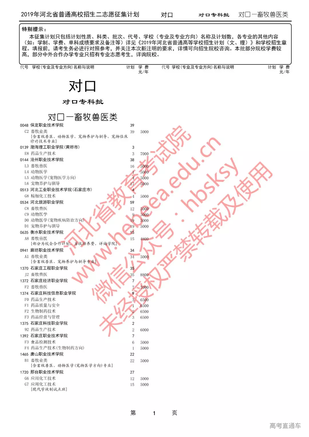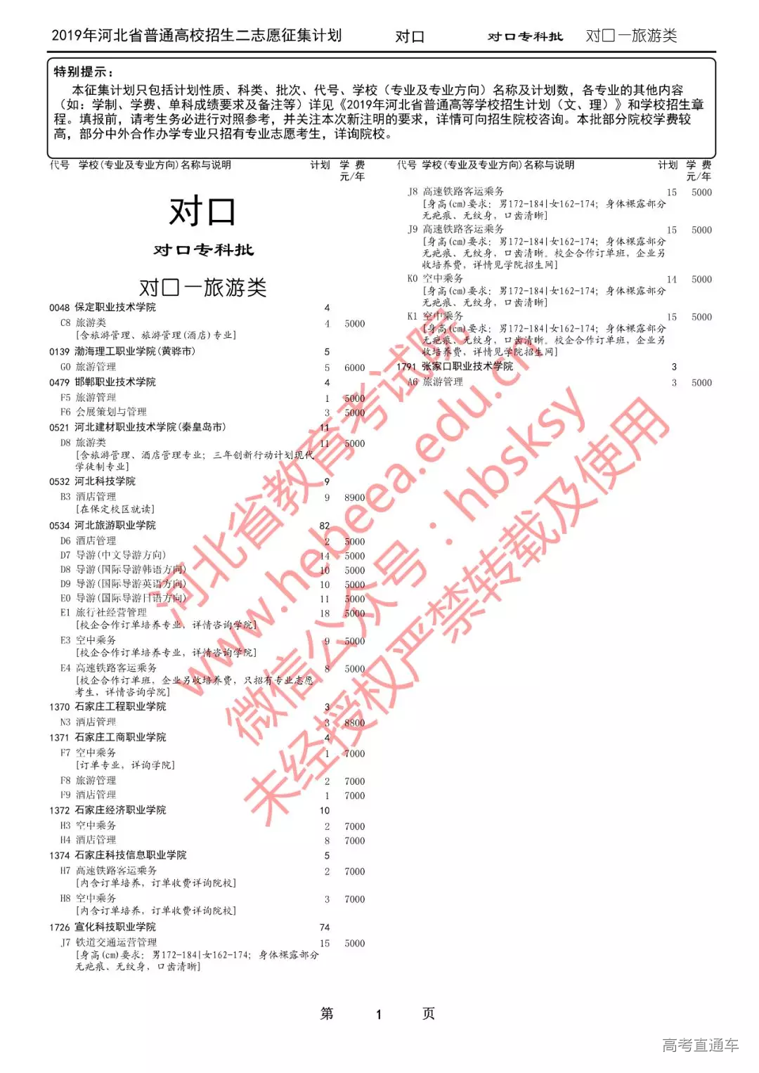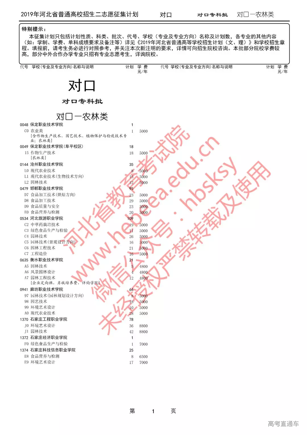 特别提醒:本征集计划只包括计划性质、科类、批次、代号、学校(专业及专业方向)名称及计划数,各专业的其他内容(如:学制、学费、单科成绩要求及备注等)详见《2019年河北省普通高等学校招生计划(文、理)》和学校招生章程。填报前,请考生务必进行对照参考,并关注本次新注明的要求,详情可向招生院校咨询。