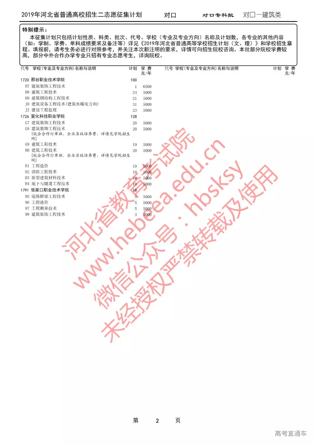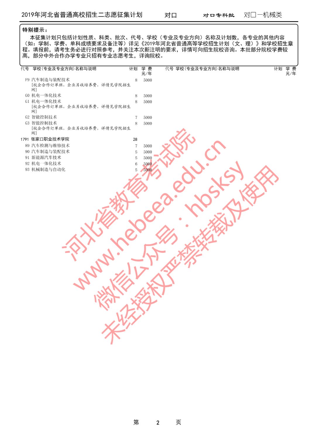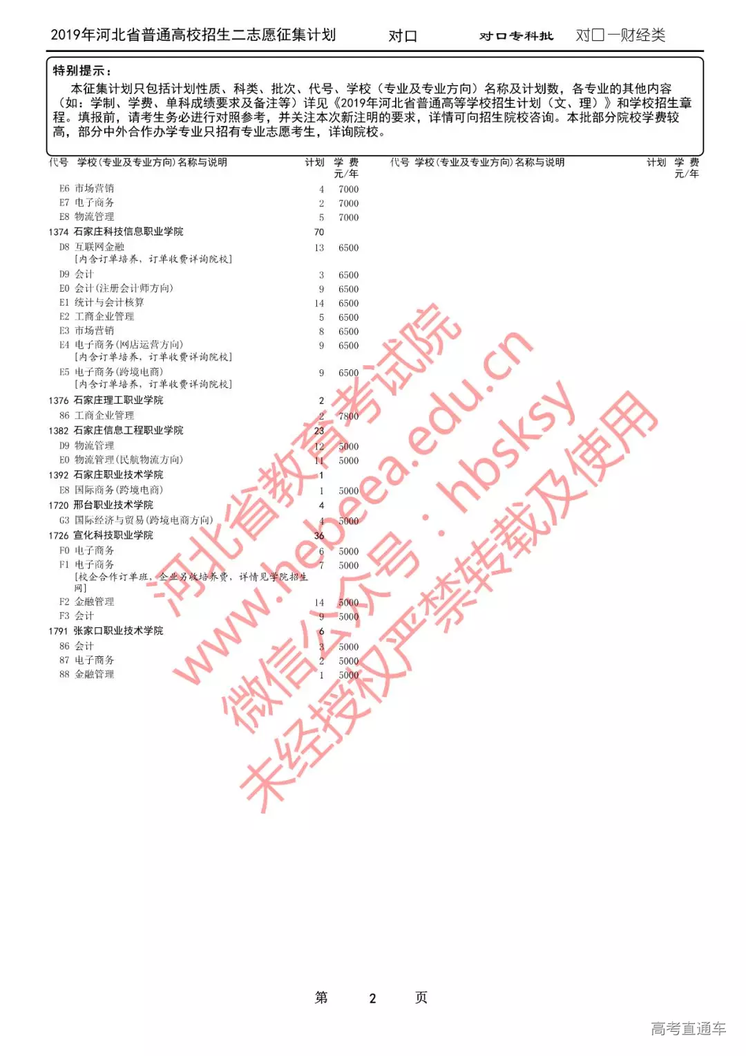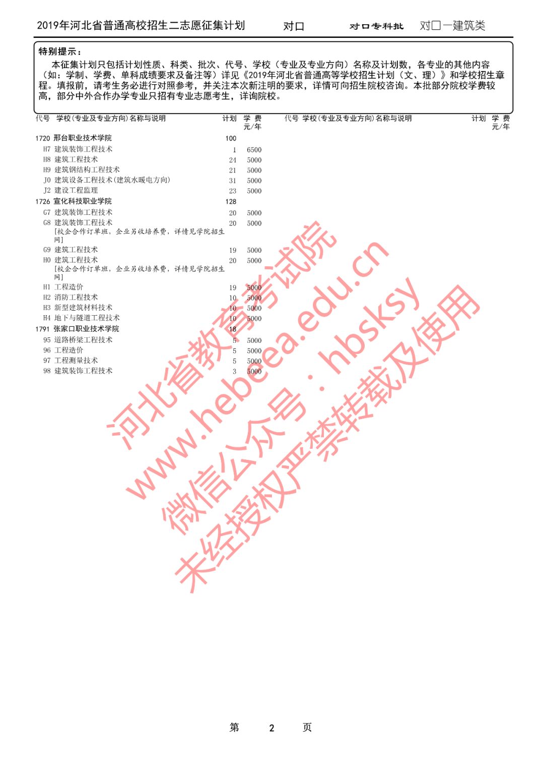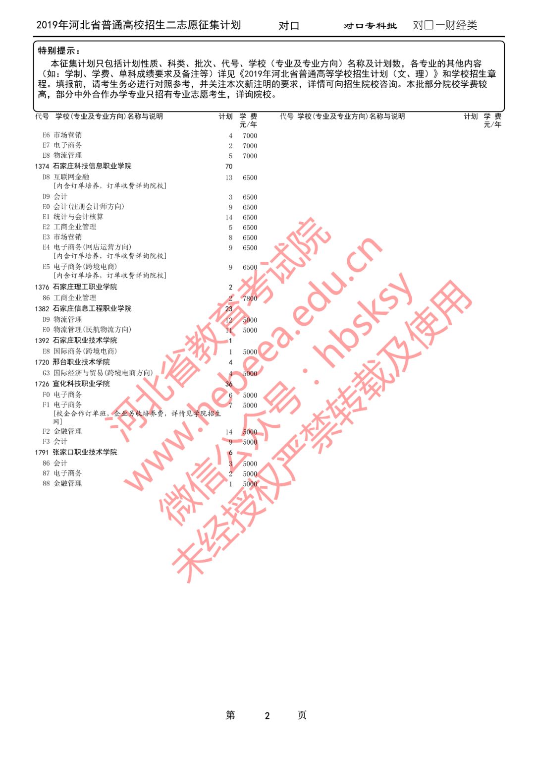 2019年河北省普通高校招生二志愿征集计划说明
