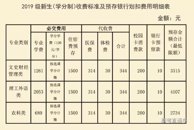 备注:从2018 年起,学分制试点的人文与法学学院、动物科学学院、电子工程学院、生命科学学院(中外合作办学专业除外)的部分相关专业,实行学分制收费。必交学费为专业学费、学分学费和住宿费,专业学费入学时按学年收取,学分学费待学生选课两周后按照选修的学分数再行缴纳,学生预存款可高于最低限额,方便缴纳学分学费。(学分学费标准:120 元/ 学分,四年制总计160 学分)。