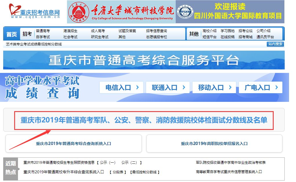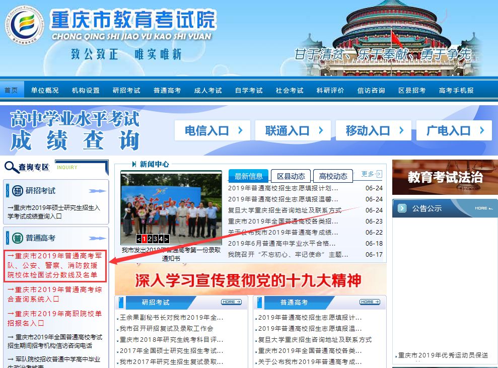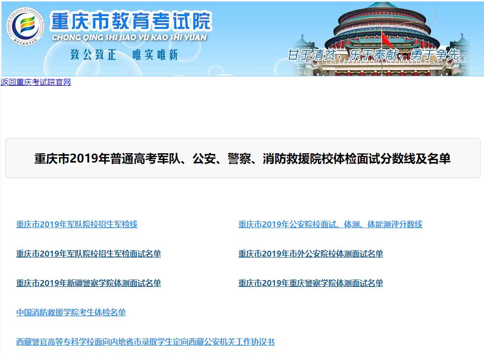 重庆市2019年普通高考军队、公安、警察、消防救援院校体检面试分数线及名单已发布!登陆重庆市教育考试院门户网、重庆招考信息网即可查阅。