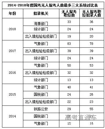 我们来看看近几年国家公务员考试中那些无人报考的职位,主要都来自统计、出入境检验检疫、气象等部门,到2018年国考无人通过人数最多的部门为海事局,共有33个职位无人报考,这些职位共计划招录36人,这些职位基本都是基层执法职位,8个职位明确要求男性,工作条件较为艰苦,这些要求导致较多职位无人问津。