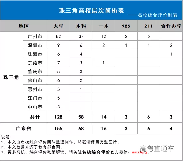 珠三角占据其中58所本科院校,绝大部分一本、985、211和合作高校。而且,哈尔滨工业大学(深圳)在2018年开始招收本科生,高考录取分数线直接超过广东老牌大学——中山大学,2019年飙升为广东省内大学理科录取分数线最高的学校。可见珠三角地区高等教育发展速度之快,变化之大。