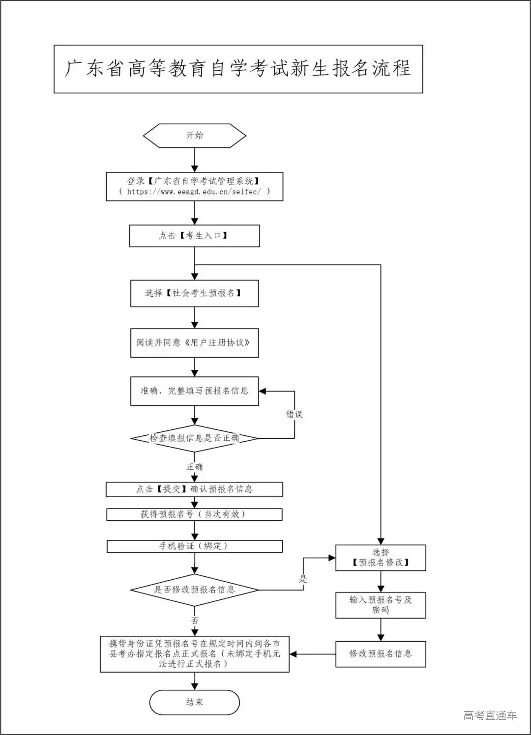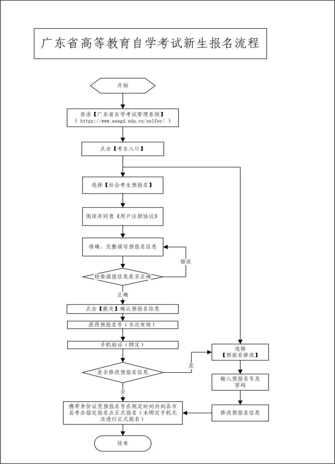 新生需要先在网上预报名,请新生务必牢记预报名号和密码,新生凭预报名号在规定的时间内到市、县 (区)指定报名点正式报名。正式报名后,新生可以获得一个唯一的准考证号码,可以使用该准考证号码报考了。