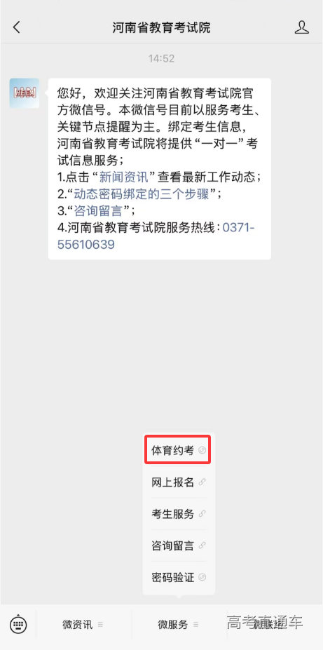 (二)进入“微服务-考生服务”界面;在规定时间内,进入“微服务-体育约考”界面(以下简称“约考系统”)绑定考生本人信息。绑定考生本人信息时间为:2026年3月5日8:00至3月8日18:00。普通类、专升本、对口招生等三类体育专业考生均须在此时间内完成信息绑定。