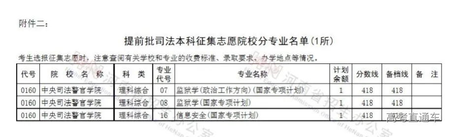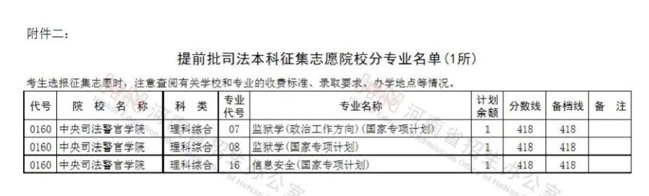 (三)司法类院校本科(中央司法警官学院):已通过国家专项计划报考资格审核合格,且司法类政审、面试、体能测试合格、高考成绩达到规定要求,目前未被任何院校录取的考生,方可补报。