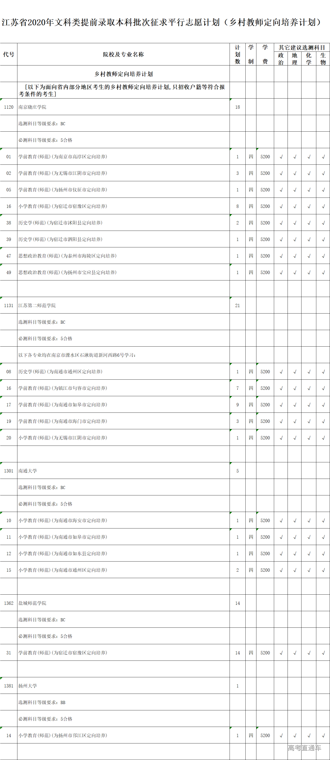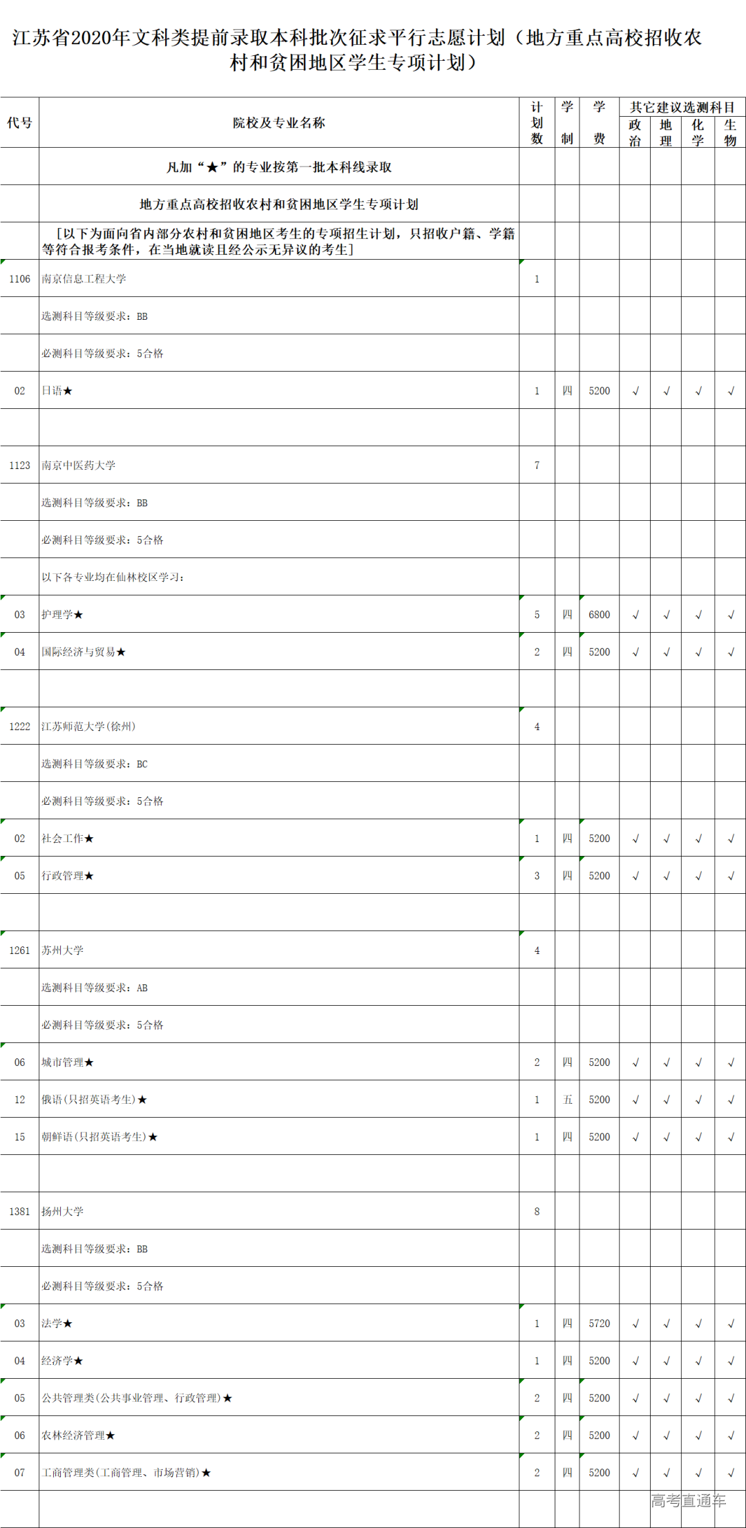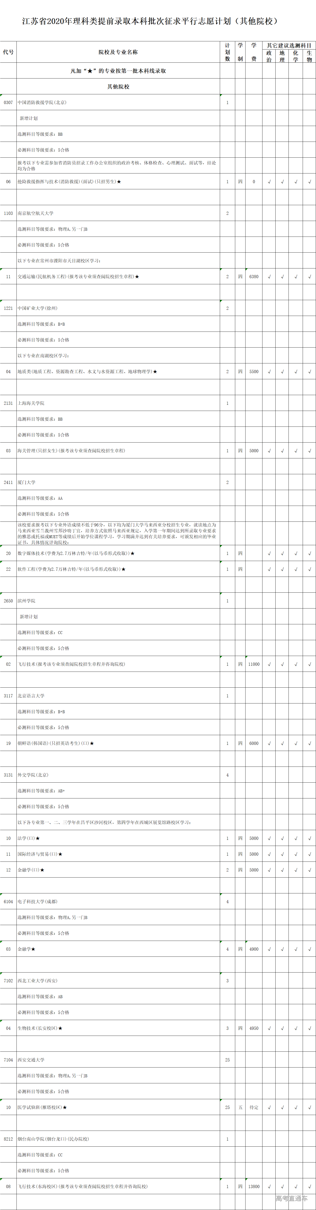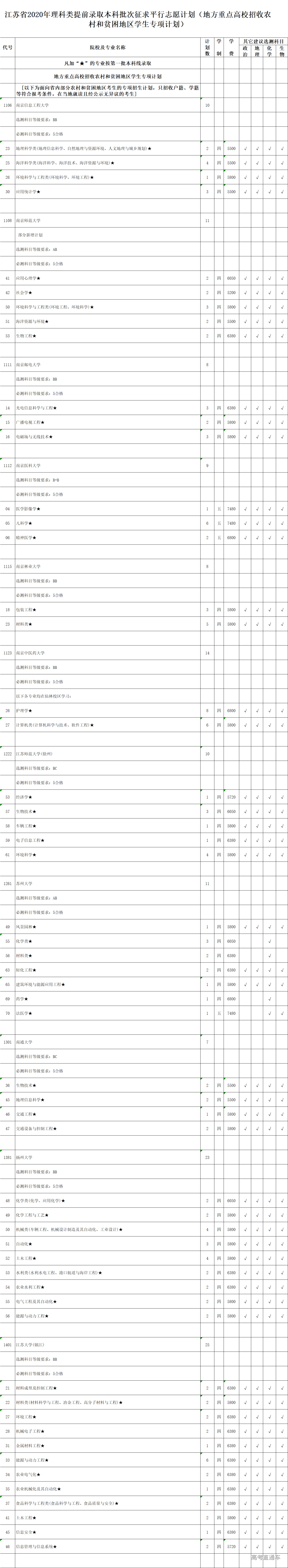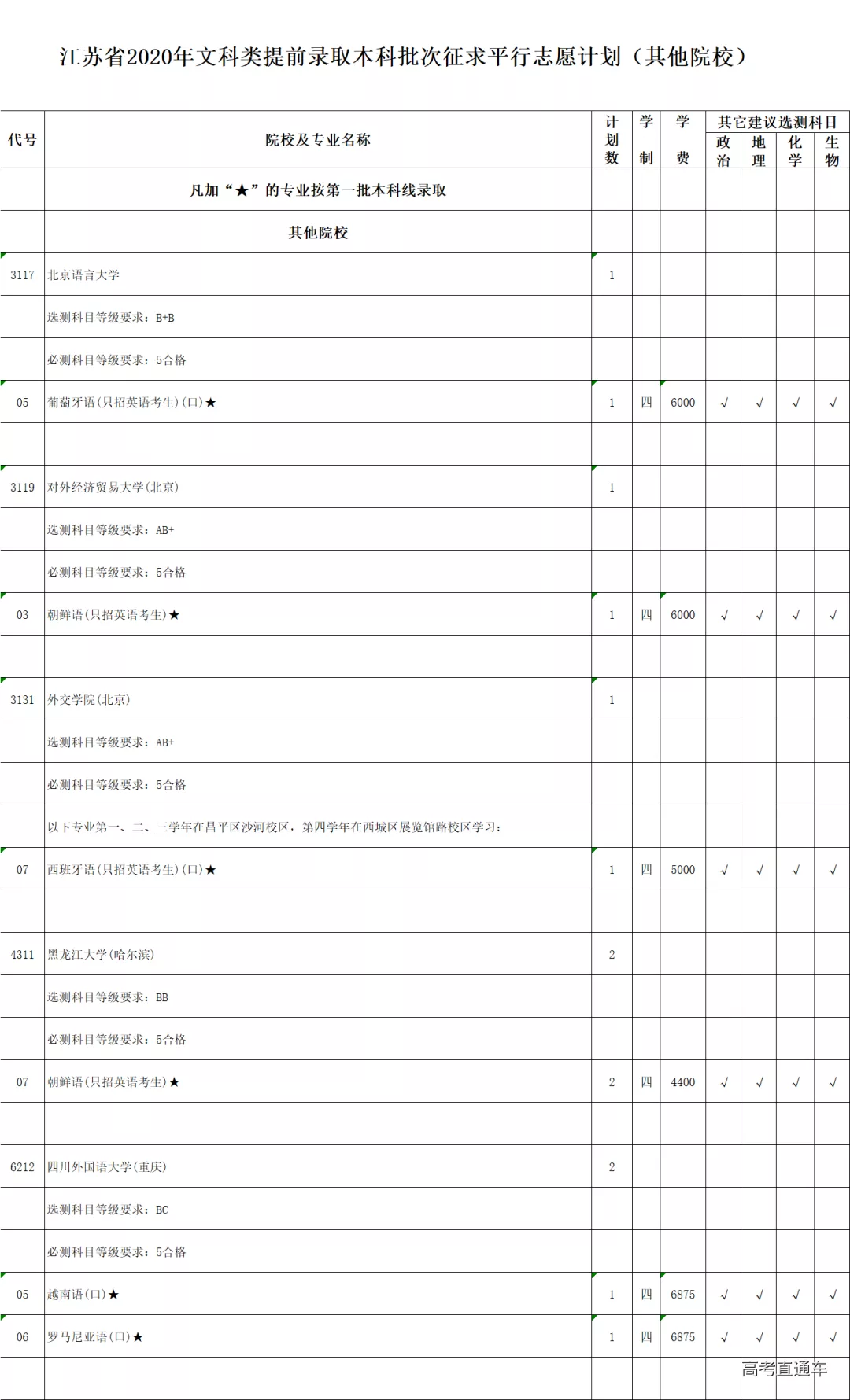 江苏省2020年文科类、理科类提前录取本科批次征求平行志愿计划具体如下: