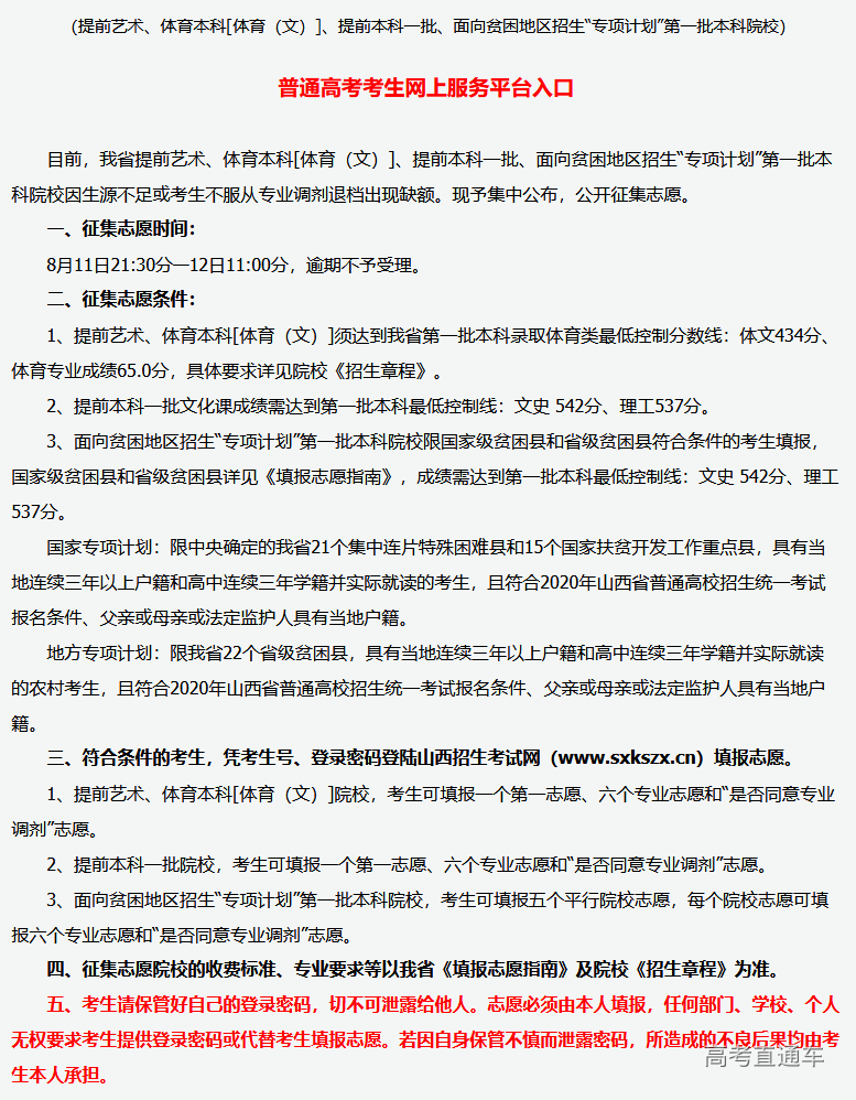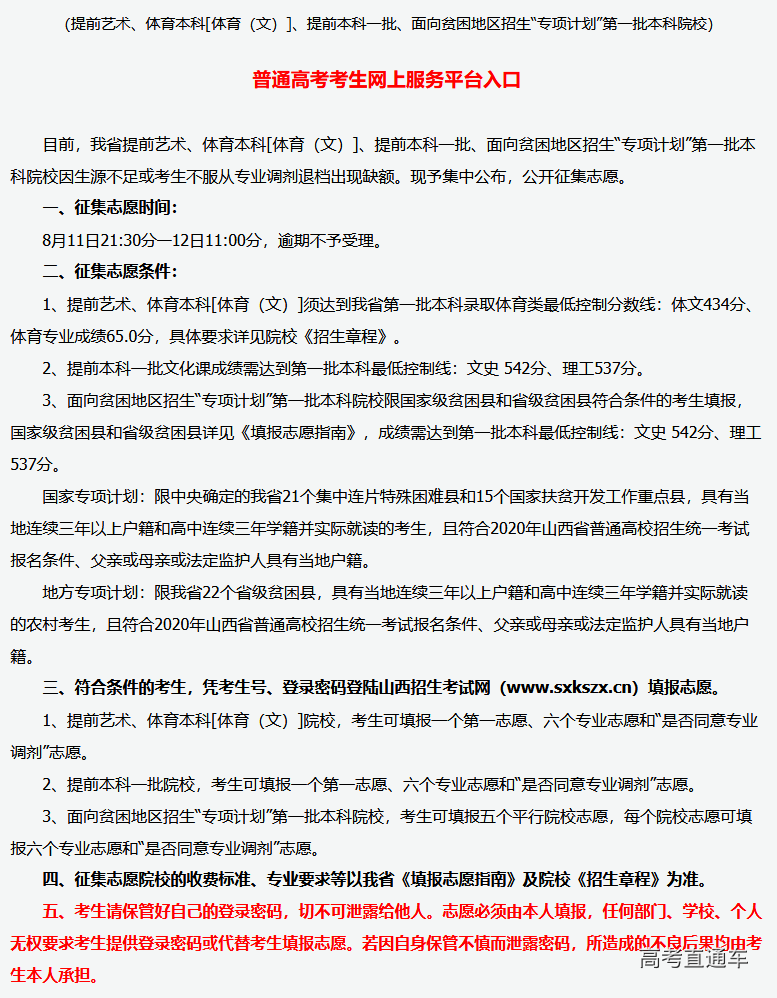 (六)国家专项计划本科批:具有国家专项计划报考资格,高考成绩达到规定要求,目前未被任何院校录取的普通类考生,均可补报相应的院校志愿。