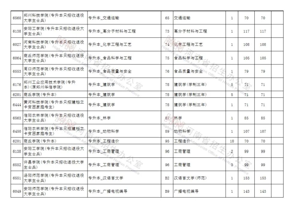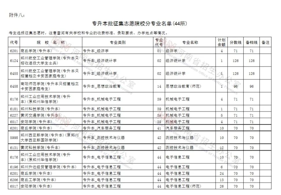 (八)专升本:凡统考成绩达到省定分数线,目前未被任何院校录取的专升本考生,均可补报相应专业的院校志愿,其中退役士兵专项计划、建档立卡贫困生专项计划要求相应资格审核通过的考生方可填报。