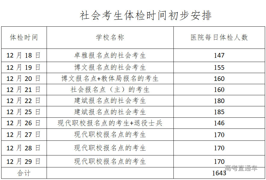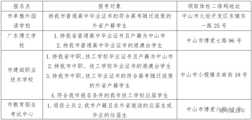 一、中山市2024年高考体检工作12月18日开始进行,我市社会考生体检安排在中山市人民医院健康管理分中心(中山市骨科医院:中山市南区茶亭路163号)进行,体检时间: 12月18日至12月29日(8:00-10:30,节假日休息),考生须完成体检预约和缴费才能参加体检,考生体检须携带身份证和高考体检二维码。