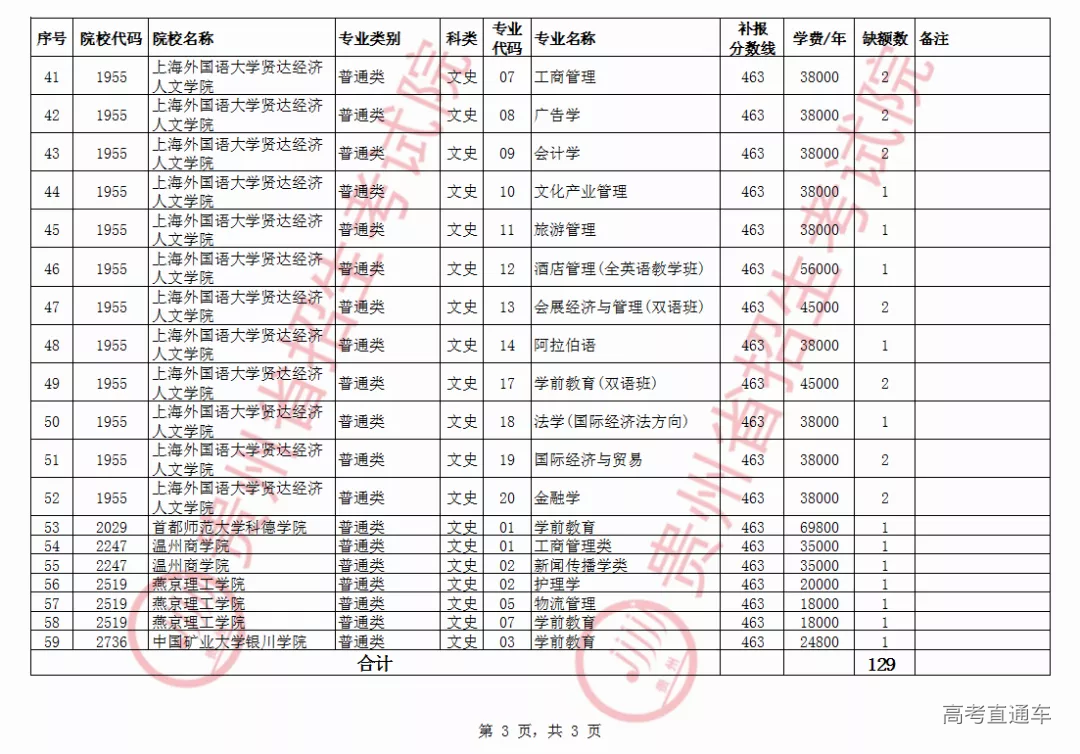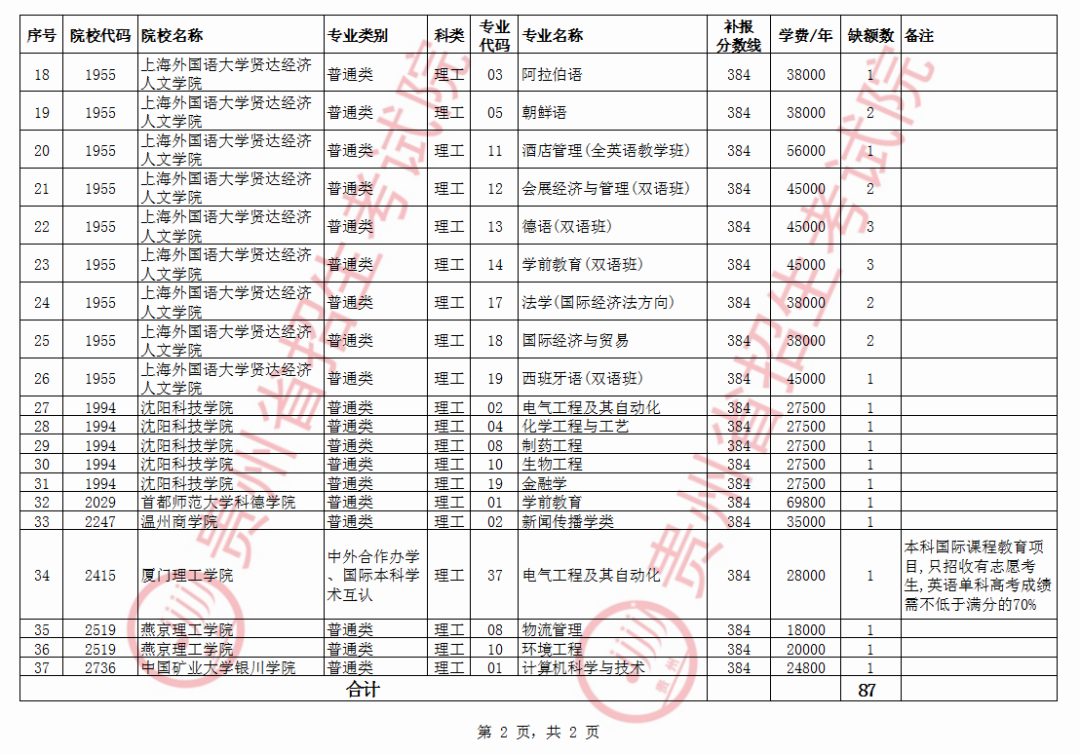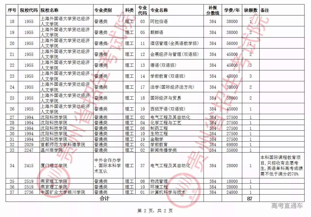 一、高考成绩达到二本线(文史463分,理工384分)的未被录取考生可根据附表公布的缺额情况及时补报志愿。