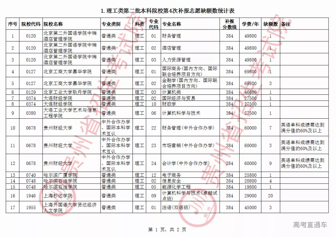 附:1.理工类第二批本科院校第4次补报缺额数统计表