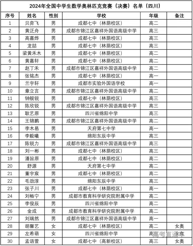 2024年第40届全国中学生数学联赛省队名单(四川)