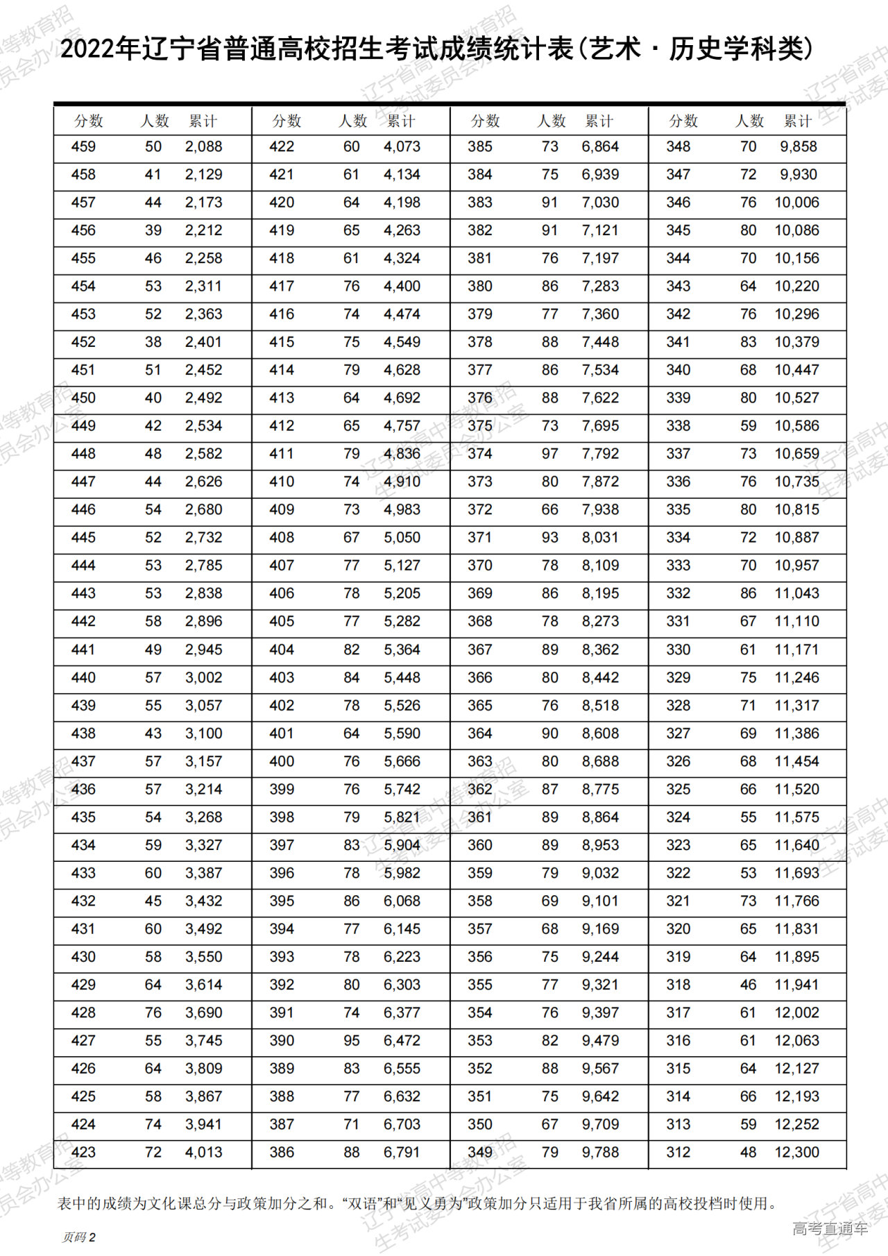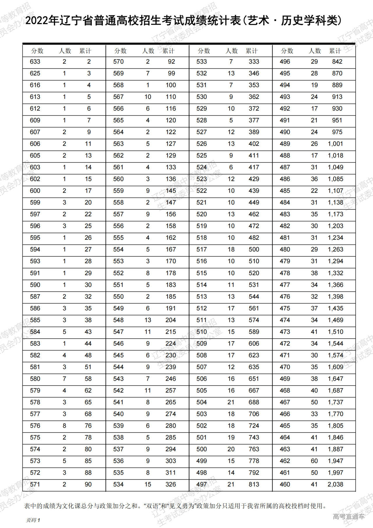 2022年辽宁省高考成绩一分一段表(艺术 · 历史学科类)
