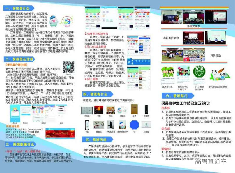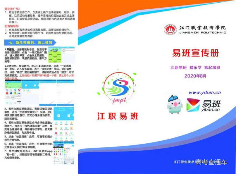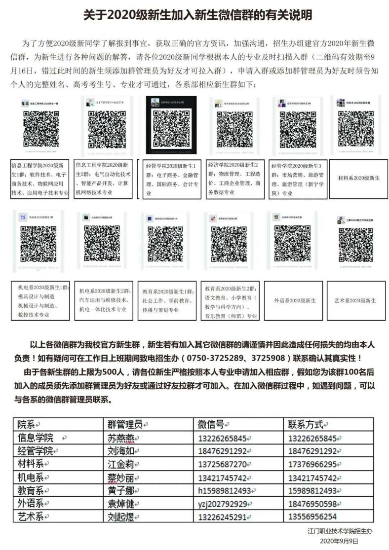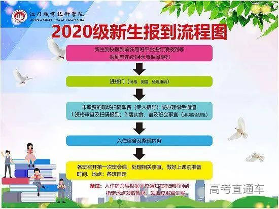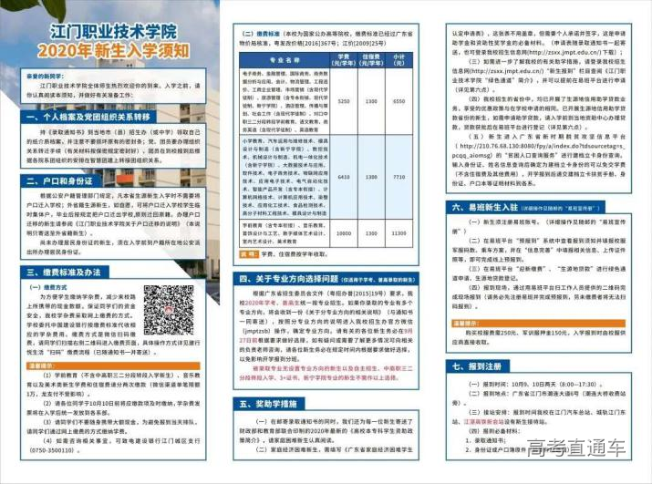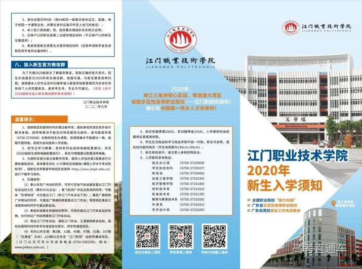 别慌! 往下翻 你的疑惑 小职来一一解答 // 重点必读篇 ① 认真阅读好2020年新生入学须知 ② 学费缴纳流程与新生官方微信群 请细读“加入官方新生微信群的说明”,按录取专业尽快加入指定的官方新生微信群(新生必须加入),获取《建行悦生活“扫码”缴费流程》,10月10日前按指引完成缴费环节!! ③ 关于江职易班 ④ 关于团费缴纳与团组织关系转接 新生可关注“江门职业技术学院青年部落”微信公众号,并通过链接在智慧团建系统进行团员组织关系转接及缴纳团费。 ⑤ 关于国家资助政策 广东省家庭经济困难学生认定申请表下载网址: http://xsc.jmpt.cn/viscms/xsc/jiangqinzhudai0014/20200915/448384.html ⑥ 关于新生应征入伍保留学籍的通知 应征入伍需要保留入学资格的新生,请将以下资料邮寄到“江门职业技术学院招生办 冯老师收,电话:0750-3725908。”为防材料丢失,请一定用邮政EMS快递寄送,不接收其他快递。10月20日前无法邮寄以上材料者,请电话联系履行登记手续,以免影响学籍注册。 (注意:不办理当兵保留学籍的同学,高职院校将会上报省考试院办理注销学籍手续,学籍注销的学生,当兵复员后不可再回来复学。) 1. 《应征入伍普通高等学校录取新生保留入学资格申请表》(县级征兵办盖章,一式二份); 2. 《入伍通知书》复印件; 3. 《录取通知书》复印件; 4. 身份证复印件; 5. 征兵办回邮地址、收件人及联系电话等。 ⑦ 关于专升本 在报到入学前后,请勿相信非官方群、非官方公众号的信息,以免上当受骗! // 开学前准备篇 ▲证件类(报到需要): 1、录取通知书 2、身份证、户口簿原件、不同尺寸和底色的证件照 身份证复印件6份(用A4纸同一面复印身份证正、底面,用于校园一卡通等业务,并要在身份证复印件上签上自己的姓名) 3、本人纸介质档案;党、团员要办理组织关系转迁证明 5、迁移户口的新生要提供的相应材料(不迁移户口的新生无需提供) 6、家庭贫困新生要提供的相应材料(这是申请助学金及资助性奖学金的必备材料) ▲生活类(建议携带,也可当地购买!): ① 秋衣和夏衣(江职晚上会比较凉快) ② 睡衣 ③ 内衣、内裤、袜子 ④ 拖鞋和运动鞋 (记得再带双备用鞋,以防下雨天替换) ⑤ 衣架、大夹子 ⑥ 被子、枕头、床垫、凉席、蚊帐 ▲洗漱类: ① 毛巾、浴巾、纸巾 ② 沐浴露、洗发水、护发素、肥皂 ③ 防晒霜、面霜 ④ 牙膏、牙刷、牙杯 ⑤ 盆子、桶 ⑥ 女生的皮筋、发卡 ⑦ 男生的剃须刀 ⑧ 洗衣液、洗衣粉、洗洁精 ⑨ 筷子、勺子 ⑩ 吹风机(要低于800瓦喔!) ▲饮食类: ① 水杯、保温杯 ② 饭盒 ③ 水果刀 ▲药品类: ① 创口贴 ② 消毒水、酒精 ③ 眼药水 ④ 感冒药、肠胃药、冲剂 ⑤ 风油精、皮炎平 ⑥ 花露水、驱蚊水 ⑦ 棉签 ▲零碎小物件类: ① 体温计、指甲钳、剪刀 ② 收纳盒 ③ 雨伞 ④ 数据线、插头、充电宝、电插排 ⑤ 钥匙扣、卡套 ⑥ 镜子、梳子、挂钩 ⑦ 床上书桌、台灯 温馨提示:不要购买大功率的电器喔! ▲学习用品类: ① 笔记本、笔 ② 笔记本电脑(根据各专业所需类型购买) ③ 书包 ④ 一本自己喜欢的课外书 // 宿舍篇 1、宿舍内,每人都有配套的书桌、柜子,大部分系按照报到顺序安排床位。 2、宿舍内标配是一间洗手间一间淋浴间。 3、宿舍床规格是0.9 x 1.9 4、宿舍有空调(可到校内空调服务中心进行租赁,以自愿为原则) 5、宿舍电器,只能使用800瓦以下吹风筒,其它电器(除电脑、电风扇、复读机外),无论多大功率也不能使用 6、宿舍内饮用水,饮水机和桶装水可以到校内售水中心租赁 7、第9、10栋宿舍有电梯 8、宿舍晚上门禁时间11:30 // 快递篇 1、学校地址:广东省江门市蓬江区潮连大道6号,江门职业技术学院。快递直接填这个地址即可。 2、学校的快递点(菜鸟驿站)位于西江月饭堂旁,快递站工作人员会发短信给手机上,根据短信上的货架号,下载菜鸟裹裹获取身份码取件。。 // 报到篇 1、学校地处珠江三角洲核心区域,位于“中国侨都”江门市市区。在距离学校3.5公里处设有“潮连站”高速出入口,到广州仅需1小时。广珠城际轻轨、深茂高铁“江门东站”“江门站”到“广州南站”仅45分钟;“台山站”高铁站离新宁学院校区仅10分钟,2路、11路、45路、47路、51路、107路等多路公共汽车线路连接学校与市区各繁华路段和汽车客运站、轻轨站,交通十分便利。 2、新生入学会有学校安排车辆接送,在江门汽车总站、轻轨江门东站和新会站有师兄师姐来接你来学校。 2020迎新场所安排图 2020级新生报到流程图 3、入住宿舍后留意学校通知并在指定时间到指定地点领取教材、领取校服军训服。 4、每个系的报到地点都不同,届时会有不同的横幅和指示牌指引。 // 学习与生活篇 图书馆 1、刷校园卡进出图书馆。 2、图书馆有自习室(已装空调),环境舒适,适合学习。 饭堂与便利店 1、学校有两个饭堂,西江月和望海潮,还有其他一些餐厅。 2、饭堂的菜式丰富,有麻辣烫、奶茶、糖水等多种选择。可刷饭卡、微信支付,也可购买饭票。 3、学校还有两个便利店,分别位于两个饭堂的附近。 01 02 03 这里给萌新们介绍一下位于西江月饭堂右侧的易捷便利店。便利店里面有三大专区:种类丰富的水果专区、新鲜美味的糕点专区、物美价廉的生活专区。商品种类繁多,价格实惠,供同学们任意选购。 2020年的萌新们 我们10月9日、10月10日的 8时00分--