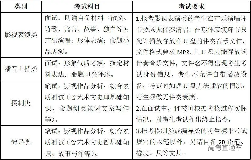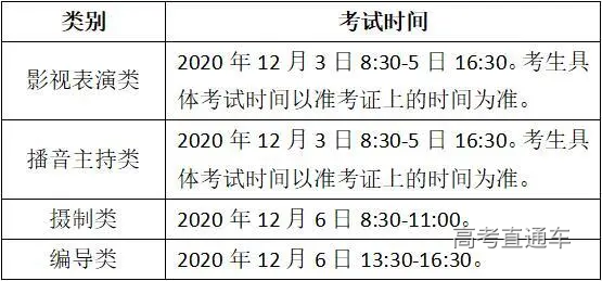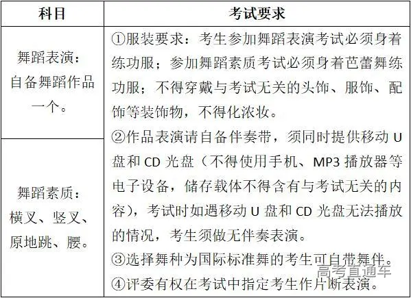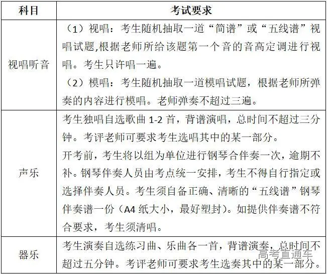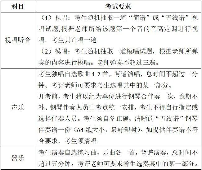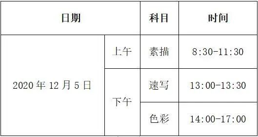 提前领码,上网打印准考证 考前14天申领健康码 根据疫情防控要求,考生须考前14天通过支付宝完成本人浙江健康码(浙江省内各市健康码可通用)的申领,考试期间自觉遵守考点疫情防控要求。 考前3天打印准考证 考生于考前3天在浙江省教育考试院网站(www.zjzs.net)“浙江省高校招生考试信息管理系统”自行打印专业省统考准考证,也可在高考报名点打印。考试当日,考生须同时携带专业省统考准考证和身份证按规定时间参加考试。 1月中旬可打印合格证 各类别专业省统考成绩将于2020年12月底前在浙江省教育考试院网站(www.zjzs.net)公布。专业省统考合格考生可于2021年1月中旬自行在考试成绩查询页面下载打印合格证。 八大类专业省统考安排 美术类 考试安排:考生在高考报考点所属的设区市参加专业考试。具体考点和考场设置由各设区市教育考试机构统一安排,并在专业省统考准考证上明确。各科目考试时间如下: 考试科目和要求:考试科目为素描、速写、色彩三门。专业满分为100分(遇小数点四舍五入),计算公式:专业总分=素描成绩×40%+色彩成绩×40%+速写成绩×20%。考试范围和要求如下: 音乐类 考试安排:考试于2020年12月14日起在浙江音乐学院(杭州市西湖区转塘街道浙音路1号)举行。联系电话:0571-89808080。考生具体考试时间以准考证上的时间为准。 考试科目和要求:考试科目为视唱听音、声乐、器乐三门。专业满分为100分(遇小数点四舍五入),计算公式:专业总分=视唱听音成绩×30%+声乐成绩×35%+器乐成绩×35%。考试要求如下: 注意,考生报名信息网上输入时须按要求选定一种声乐唱法和一种乐器;考试时,须与报名时选择的声乐唱法和乐器相一致,不一致的,该科目不予评分。 影视表演、播音主持、摄制、编导类 考试安排:考试在浙江传媒学院杭州下沙校区(杭州市下沙高教园区学源街998号)举行。联系电话:0571-86832600。如报考人数超过考点可容纳的上限,考试将启用备用考点,请考生及时查看相关通知。各类别考试时间如下: 考试科目和要求:各统考类别专业满分为100分(遇小数点四舍五入)。具体科目和要求如下: 时装表演类 报考条件:身体健康,无色盲、色弱,未婚,年龄一般不超过22周岁(1999年9月1日后出生),女生身高一般在1.65米及以上,男生身高一般在1.80米及以上。具体录取条件以各高校招生简章要求为准。 考试安排:考试于2020年12月12日在浙江理工大学(杭州市下沙高教园区二号大街928号)举行。联系电话:0571-86843333。 考生于2020年12月12日上午7:30到考点报到,携带《2021年浙江省普通高校招生考生报名证(艺术报考证)》、身份证和时装表演类专业省统考准考证,按规定时间参加抽签、候考和考试,逾期不补。考试当日,考生还需携带4张7寸泳装彩照(含全身正面、侧面、背面及头部正面特写各一张,照片背面请用马克笔清晰书写考生姓名、联系电话和准考证号)。 考试内容和要求:专业满分为100分(遇小数点四舍五入),由形体测量(30%)、形体观察(30%)、台步展示(30%)、才艺表演(10%)四部分组成。台步展示环节,考生须自备高跟鞋和不带裙边的纯色分体泳装。才艺表演环节,考生须从舞蹈、健美操、艺术体操中自选一项,自备服饰和音乐U盘(限MP3格式)。形体观察、台步展示和才艺表演全程摄像。 舞蹈类 考试安排:考试于2020年12月12-13日在浙江音乐学院(杭州市西湖区转塘街道浙音路1号)举行。联系电话:0571-89808080。考生具体考试时间以准考证上的时间为准。 考试科目和要求:考试科目为舞蹈表演、舞蹈素质两门。专业满分为100分(遇小数点四舍五入),计算公式:专业总分=舞蹈表演成绩×50%+舞蹈素质成绩×50%。具体要求: 注意,考生报名信息网上输入时须按要求选定一种舞种,考试时舞种须与报名时选择的舞种相一致。