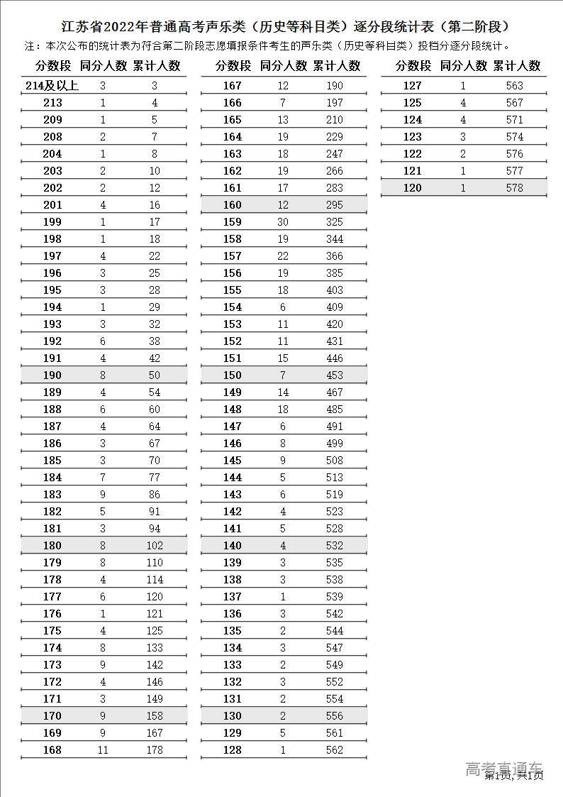 江苏省2022年高考第二阶段一分一段表(历史声乐)