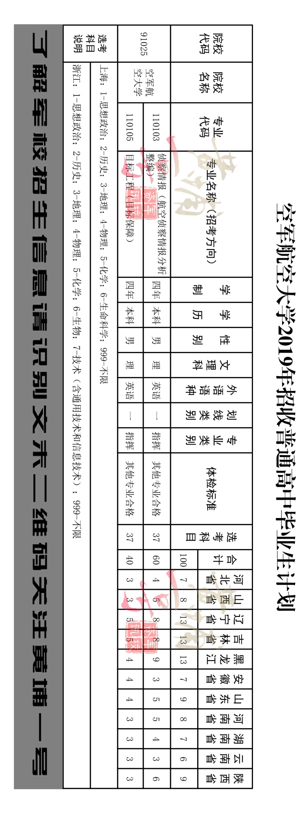 航空飞行与指挥(飞行技术)——培养目标为空军航空兵部队飞行军官,学制四年,包括地面理论教育和飞行训练两个阶段。该专业招生对象由空军招飞部门统一招录 侦察情报(情报分析整编)专业是培养适应未来联合作战情报保障需求,具有大学本科学历和军官基本素质初级指挥军官。学员毕业授予军事学学位,招生对象为应届高中毕业生,学制4年,体检要求“其他专业合格”。目前,情报分析整编专业拥有多个高水平专业实验(习)室,并在校外设立供学员岗前培训的实习基地,师资力量雄厚,多年来已为部队输送了大量的情报尖兵。 目标工程(目标保障)专业是培养适应未来联合作战目标保障需要,具有大学本科学历和军官基本素质初级军官。学员毕业授工学学士学位,该专业师资力量雄厚,专业教学条件优越,为军队2110工程重点建设专业。招生对象为应届高中毕业生,学制4年,体检要求“其他专业合格”。