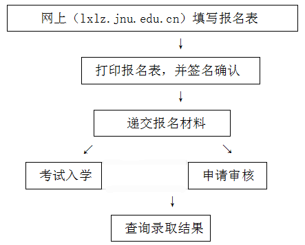 考生需登入报名网填写报名信息,经提交成功后,生成《暨南大学、华侨大学招收港、澳、台、华侨、华人及其他外籍学生报名表》(注:表格不设下载链接),经提交成功,再打印报名表,核对无误后,签名确认,并附上所需报名材料到各招生处办理现场确认,同时缴付报名费。如未设立招生处的国家和地区,考生可直接将报名材料(副本)邮寄至暨南大学招生办公室,办理报名确认手续,在入学报到时补交报名费。