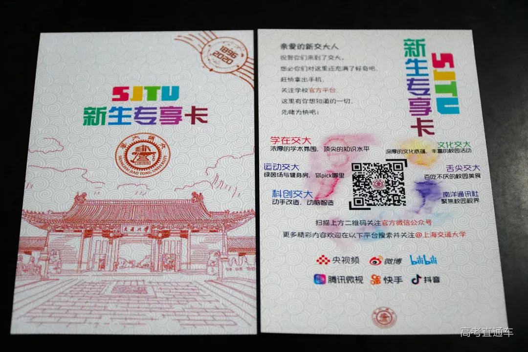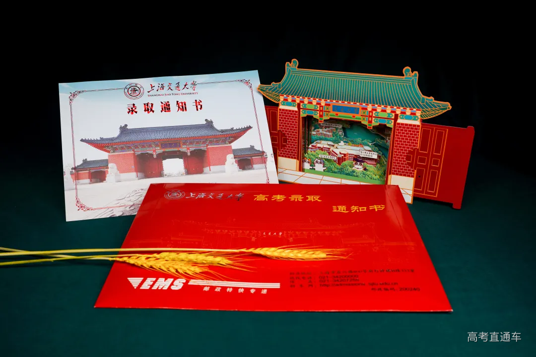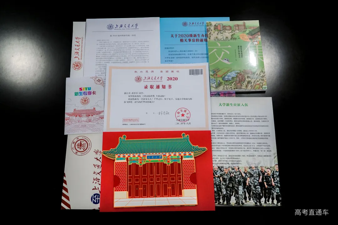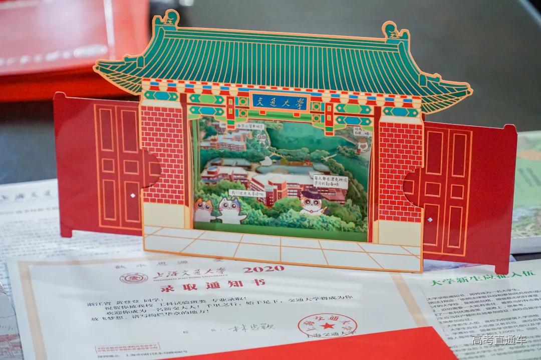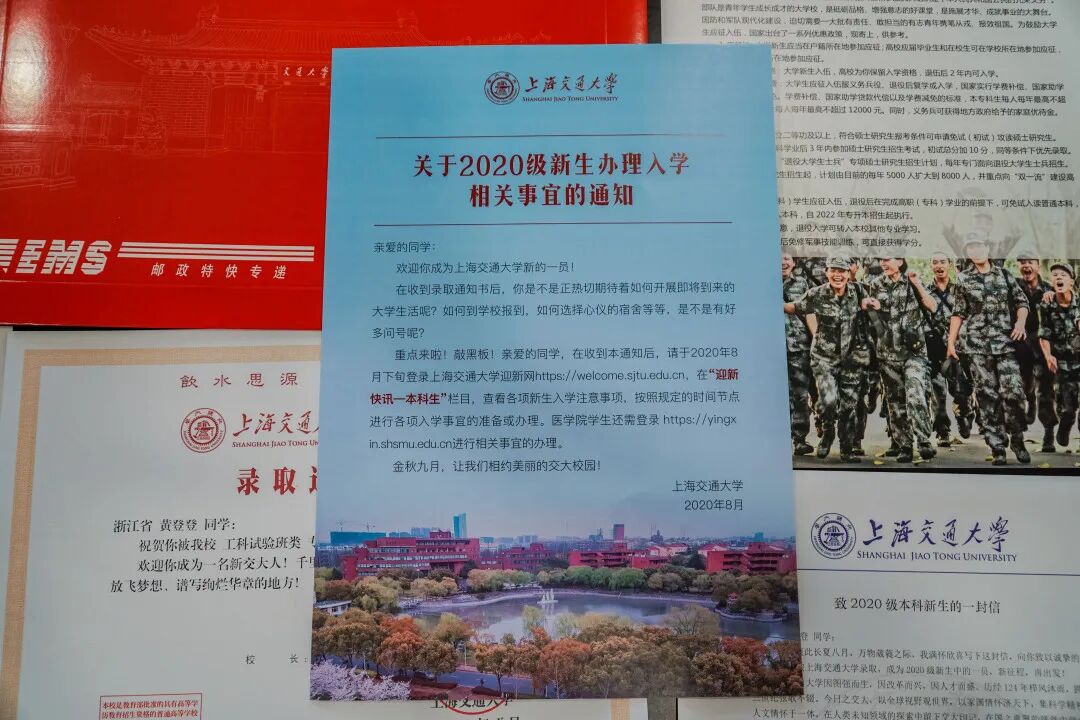 黄登登——0001号录取通知书收件人 毕业于浙江省义乌中学的黄登登同学,高考取得了703分的好成绩,同时获2020年浙江省综合评价(暨三位一体)选拔第一名,录取至交大工科试验班类。她从小学开始就一直担任班长,学校大队长,获评十佳阳光学生,金华市美德少年,十佳阳光歌手等,高中还任团支书,深受老师同学喜爱。热爱足球和跑步的她,是学校运动会上的常客;数十年钢琴和声乐的练习,练就了她自律沉稳的性格。 她一直非常向往上海交大,来交大面试时,家人特意陪她骑自行车看了学校的各个校门,她直接飞奔到东大门拍了这张青春照片~得知录取后,全家人非常开心,悬着的一颗心终于放下了。黄登登说:“交大一直是我的梦想,我对数学比较感兴趣,之前也接触了一些编程知识,所以想学信息一类的专业。"面对即将开启的大学生活,黄登登充满向往。在新的篇章里,她会在追求卓越的道路上砥砺前行,继续闪耀光芒! 录取通知书 录取通知书的正面以“紫气东来门”为背景,镶嵌着“交通大学”四个字的门匾熠熠生辉,大门的后方是以上海交通大学创始人盛宣怀命名的“宣怀大道”,象征着巍巍百年学府正张臂拥抱来自五湖四海的莘莘学子。 录取通知书的反面,不仅有校训、校徽,还印写着“千里之行,始于足下,交通大学将成为你放飞梦想,谱写绚烂华章的地方”,右下角是校长林忠钦的签名。 这是新生收到的包裹中最重要的一部分,开学时千万不能忘记带哦! 新生大礼包 致2020级本科新生的一封信 来自校长的殷切寄语 新生大礼包中,上海交大校长、中国工程院院士林忠钦深情寄语2020级本科新生,勉励即将入学的学子继承交大传统,磨炼本领、砥砺前行。 新生专享定制交大校门3D卡 交小喵拍了拍你 有一封来自交大的专属请柬 2020年校门卡外形为交大校门,以“交大红”为主色调,采用别出心裁的抽拉纸雕形式,校门卡在未拉开时为关闭的平面交大校门形象,拉开时缓缓变为立体五层纸雕,美丽的校园内景也随着校门的拉开而逐渐流露呈现。画面以思源湖俯视图为背景,以六只热情欢迎新生来到交大的“交小喵”为主人公,展开一幅丰富多彩的校园生活画卷。其中C位“交小喵”头戴魔法学士帽,浓浓学霸气息;最前方的两只“交小喵”则手拉手迎接新生的到来。校门卡的背面,印有交大“饮水思源,爱国荣校”的校训和唐文治老校长提出的“欲成学问,当为第一等学问;欲成事业,当为第一等事业;欲成人才,当为第一等人才。欲成第一等学问、事业、人才,必先砥砺第一等品行”人才培养理念,寄寓着对新交大人的鼓励。与往年相比,今年的校门卡既传承了交大的深厚文化,又在设计理念,元素和形式上加以创新,特别是吉祥物“交小喵”的加入使得整体风格更为活泼,既有仪式感又生动可爱,以一种别开生面的形式欢迎着新生的到来。原创“交小喵”吉祥物于今年2月设计诞生,为考生们送去了系列招生资讯动态,包括“交小喵的五个稳"”交小喵课堂“”交小喵通知书“等等,陪伴见证大家的一路成长。 2020新版校门卡由交大学生团队苏洛妮设计制作。从初稿到定稿,经过重重方案筛选、颜色调整、打样定夺……最终以全新的创意形式为广大新生们送上进入交大的第一份“入门礼”。 交集 一册在手,交大我有 “交集——徜徉在思源湖畔,遇见心中的交大“ 书籍贴心梳理,人物篇包含了往届新生故事和优秀学子案例,让榜样的力量伴随你前进;风景篇带你一同领略四季交大;学习篇丰富实用,打卡图书馆、自习室,还有常用学习网站介绍;生活篇七彩斑斓,八方美食、温馨宿舍、活力运动;还有暖心的勤工助学、助飞资助等政策介绍……你最想知道的交大攻略和故事,这里都有! SJTU新生专享卡 提前开启你的大学之旅 “学在交大、运动交大、科创交大、文化交大、舌尖交大”......扫描“SJTU新生专享卡”上的二维码,输入关键词,就可全方位了解交大衣食住行,提前开启你的大学之旅! 新生应征入伍宣传单 到国家需要的地方去 依照法律服兵役和参加民兵组织是中华人民共和国公民的光荣义务”。“新生应征入伍宣传单”鼓励青年学子到部队砥砺品格、增强意志、成长成才。 行李标签 暖心交大,贴心举措 交大新生可在行李上贴“上海交通大学行李标签”,通过铁路局托运,学校就将统一到铁路上海站或上海南站提取行李,使新同学可以轻轻松松来校报到入学。 入学办理 收藏贴士,办理无忧 关于2020级新生办理入学相关事宜,请仔细阅读这张通知哦~ 8月下旬需登录上海交通大学迎新网,在“迎新快讯---本科生”栏目,查看各项新生入学注意事项,按照规定的时间节点进行各项入学事宜的准备或办理。 随着第一份通知书的寄出,其他通知书也将陆续发放到同学们的手中。由于录取结束后,要为每位新生制作银行卡并放入录取通知书内,因此录取结束后的三到五天才能将录取通知书发出。上海交大招办老师也提醒大家,查询到录取信息之后请耐心等待,招办将于第一时间公布各省录取通知书的发放情况,没有公布时间的省份,表明相关工作还未结束。