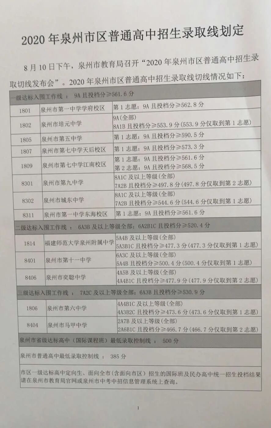 今年泉州全市普通高中最低录取控制线为385分,各普通高中学校不得擅自招收最低录取控制线下的考生。体育低于12分,不能录取一级达标高中校。