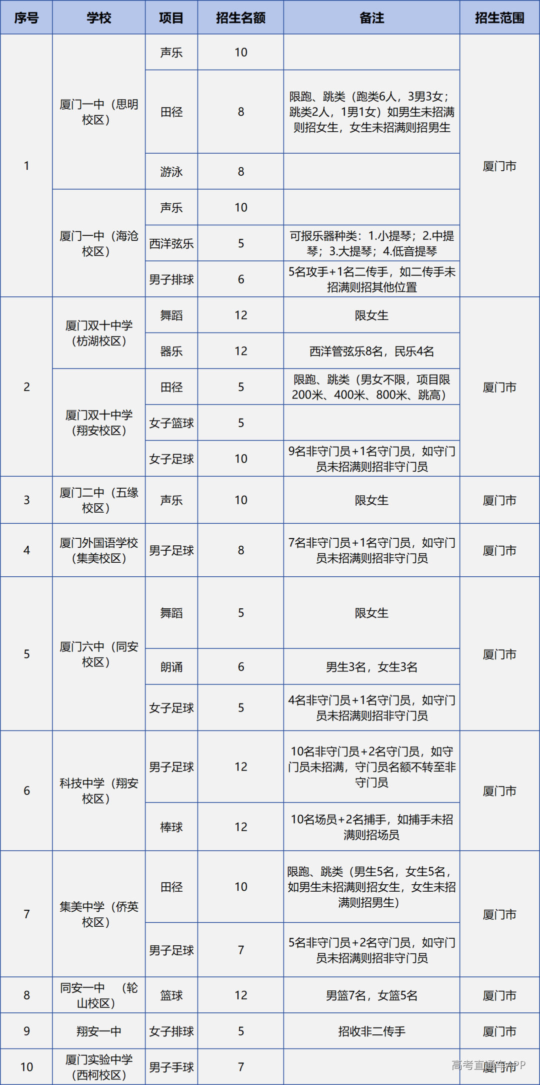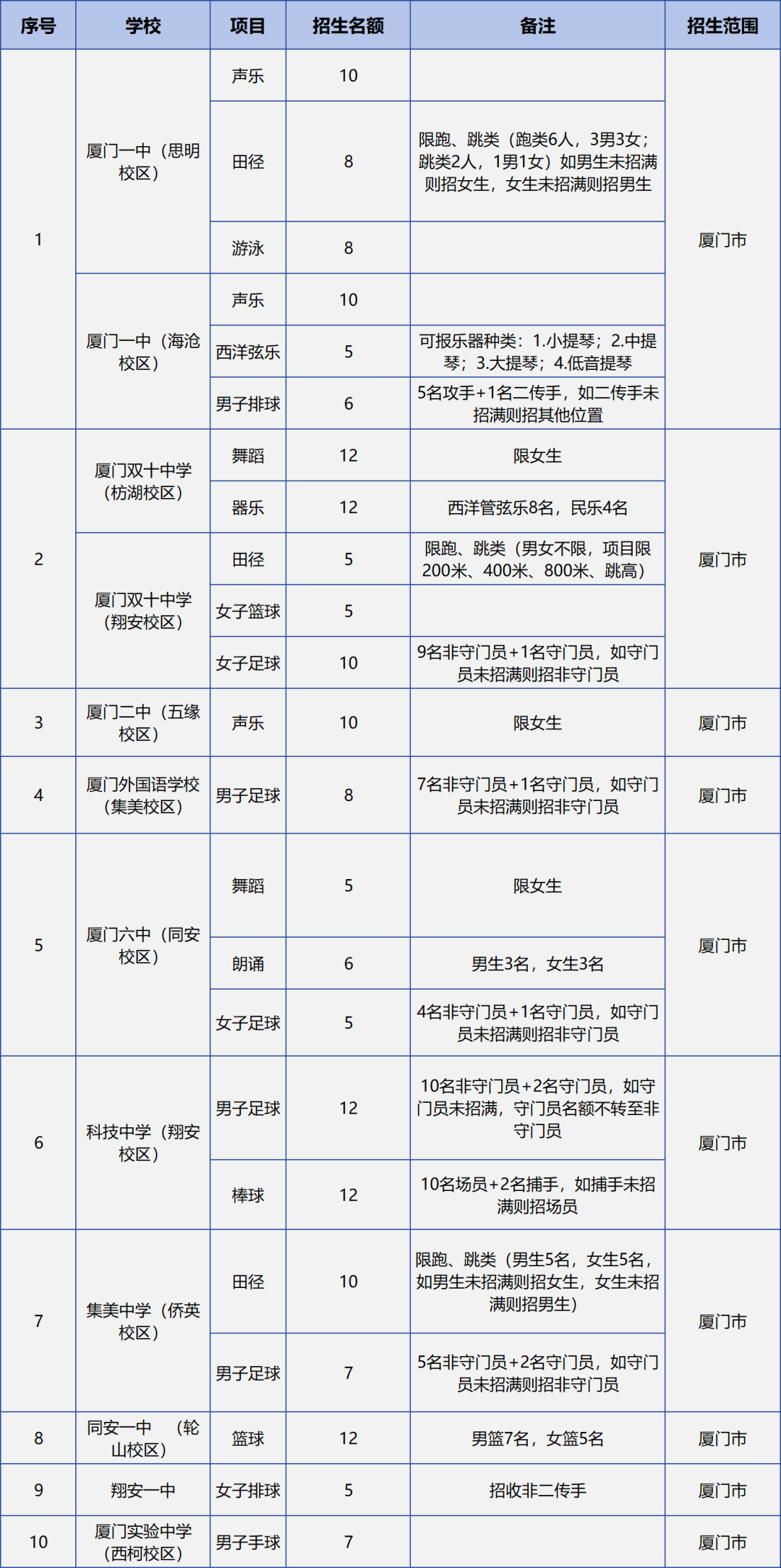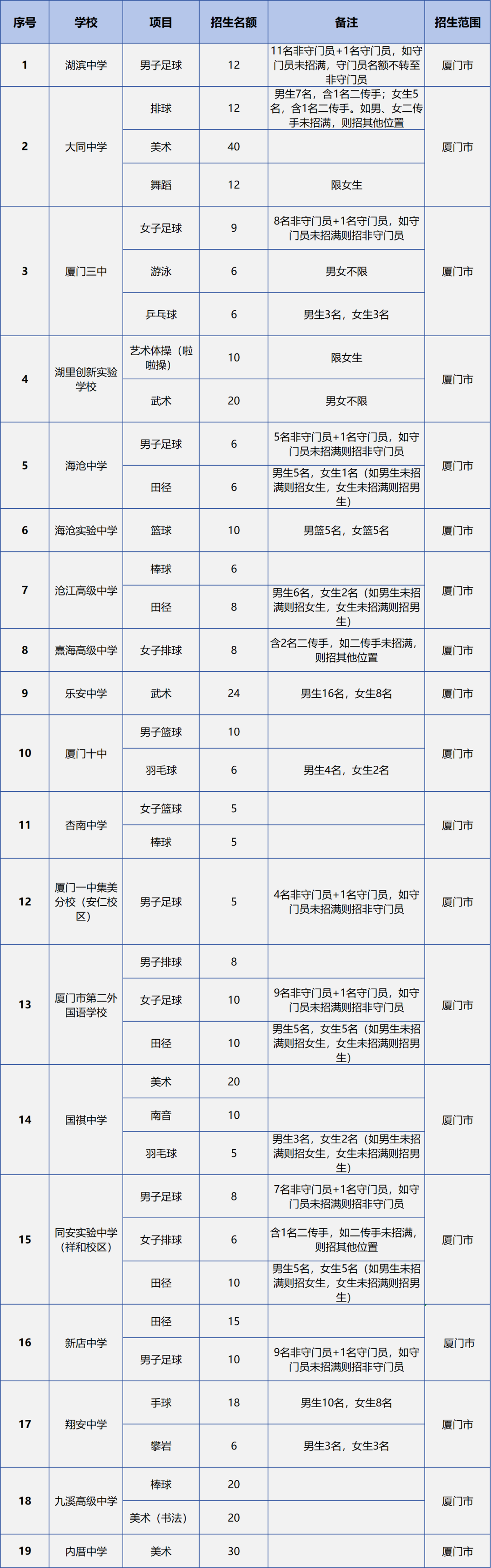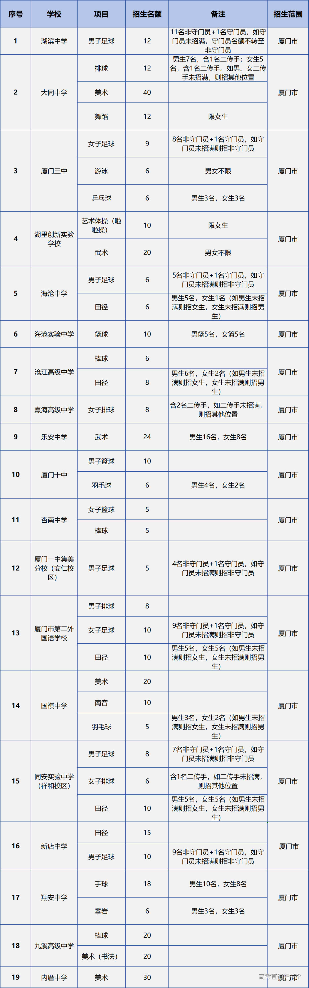 根据《厦门市2026年高中阶段学校招生工作方案》,结合学校办学特色、培养措施、师资保障等情况,同意厦门一中等30所学校进行高中阶段体育艺术类自主招生,详见后文《2026年厦门市高中阶段体育艺术类自主招生学校名单》。