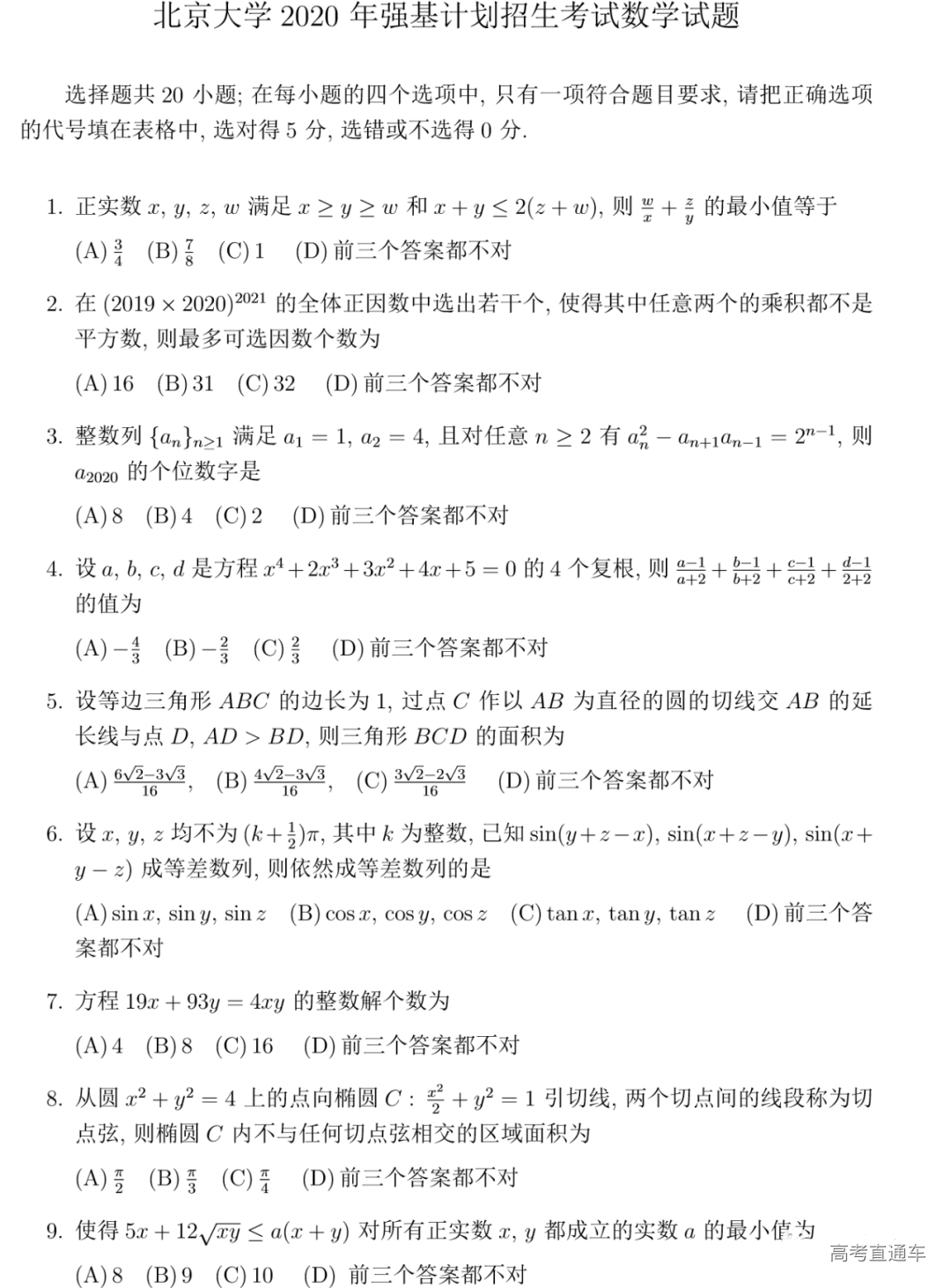 2020年强基计划校测难度如何?对比往年自主招生考试难度是否升级。小车为大家收集整理北京大学2020年强基计划数学试题,供大家参考。