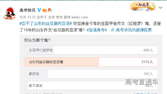在新浪教育发起的高考作文调查中,“你认为哪套题作文题最难写”、“你认为哪套作文题最有心意”、“你认为哪套作文题脑洞大开”均是“全国甲卷”独占榜首且票数大幅度领先。