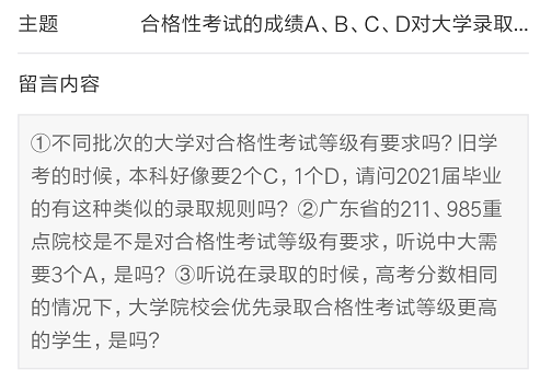 考试院给出的答复是:“合格性考试成绩是学生综合素质评价的一个重要组成部分。一般来说,高考分数相同的情况下,合格性考试等级更高的学生竞争力会更强,但各高校在招生录取时如何使用合格性考试成绩,由招生高校自主决定。请查询各招生高校的招生章程提出的对合格性考试成绩的要求。”