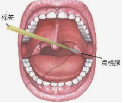 口咽拭子的取样比较简单,取样前,患者需清水漱口,然后头部微仰,医生在患者嘴巴张大,发出“啊”声的同时,迅速将棉棒拭子深入到双侧咽扁桃体和咽后壁,擦拭并吸附分泌物。