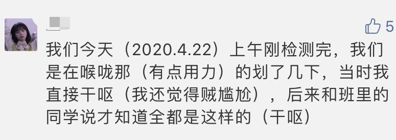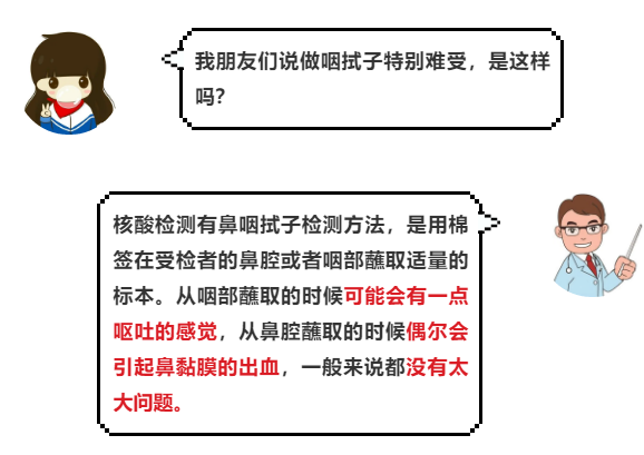 目前据同学反映,广州进行的核酸检测是两种方式都会出现,会学校选定其中一种,也会给同学自己选研究比较了同一患者同时鼻拭子和咽拭子两种采样方式所取标本的病毒核酸检测结果,发现鼻拭子标本阳性率高于咽拭子标本,即病毒核酸检测敏感性鼻拭子取材效率高于咽拭子。鼻、咽拭子标本各100份,其中鼻拭子取材行新型冠状病毒核酸检测阳性89例次,阳性率89%;而咽拭子取材病毒核酸阳性检出率仅为54%(54/100),结果见表1。鼻拭子标本的病毒核酸阳性率高于咽拭子采样标本,差异有统计学意义(2=3.8504,P=0.0497)参考资料:中国呼吸与危重监护杂志《鼻拭子与咽拭子两种取样方法在新型冠状病毒核酸筛检中的比较研究》而国家卫健委于2月8日发布《新型冠状病毒感染的肺炎诊疗方案(试行第五版修正版)》已将标本采集"咽拭子"更新为"鼻咽拭子"。为提高检测阳性率,建议采集同一患者鼻咽拭子、口咽拭子,然后放到同一采集管中送检。所以,同时采集应该是更准确一些,不过营长也不是专业人士,所以资料仅供参考哦!采集鼻咽拭子和采集口咽拭子,是会产生一些不适感的,伴随着受检测者恶心、咳嗽,拭子在与鼻咽或口咽黏膜的接触中提取检测物。事实上,每个人的耐受能力是不一样的,有同学的不适感强烈,也有同学表示轻轻松松如果你还没有进行核酸检测,那么就要留意检测的一些注意事项1、提前清水漱口了(漱口的目的是去除口腔杂菌;另外避免在饭后2h内进食发生恶心呕吐产生喷溅)鼻咽拭子标本取得越深,取得样本量越大,检测越准确。但是越深可能也会越不舒服,不过都是可以接受的,需要忍一下,不要躲闪和推挡。(一些人在采集的过程中会出现下意识的往后躲,甚至拿手推采集者的动作,使鼻咽拭子碰到无关的部位,造成污染。)3、采集鼻咽拭子需要略微抬头就行,可能会有点不舒服,坚持一下就好。【医护人员尽量站在被采样者右侧面,将拭子以垂直鼻子 (面部) 方向插入鼻孔, 直至手指接近鼻子,拭子一定要伸到鼻咽部,停留15-30秒, 然后轻轻旋转3次。】4、采集口咽拭子需要稍抬头,张大嘴,舌根压低,把扁桃体露出来(就像医生给您看嗓子一样),会有点恶心,要忍住。(必要时使用压舌板)。病毒看不见摸不着,现在唯一能检测的就是病毒的基因。在口腔里面刮一刮,鼻子里刮一刮,就可以在一个机器里把病毒基因给测到,只要阳性的就肯定有。所以核酸检测对于筛查无症状感染者,意义非常大。那么我们是否真的要等到没有一例病患才恢复正常的生活呢?张文宏医生的看法:张文宏认为,境外输入的压力将持续存在,疫情在短时间内结束似乎已不可能,各地医疗体系要时刻保持强大的敏感性、警觉性和快速反应,而对于普通民众来说,可能要学会习惯疫情的常态化,一边上班,一边抗疫。现在很多人认为就应该一个病例都没有,才可以回到正常生活。那我现在告诉你,别做梦了,这种生活是不正常的,因为全世界现处于大流行。现在偶尔出现的一例两例病例不要奇怪,我们要开始进行常态化的抗疫。在很长一段时间我们的重点应该迅速回归到正常的生活,该读书的读书,该工作的工作,恢复经济。偶尔出来一个新冠肺炎病人我们把他迅速治疗掉,这个才是合理的。