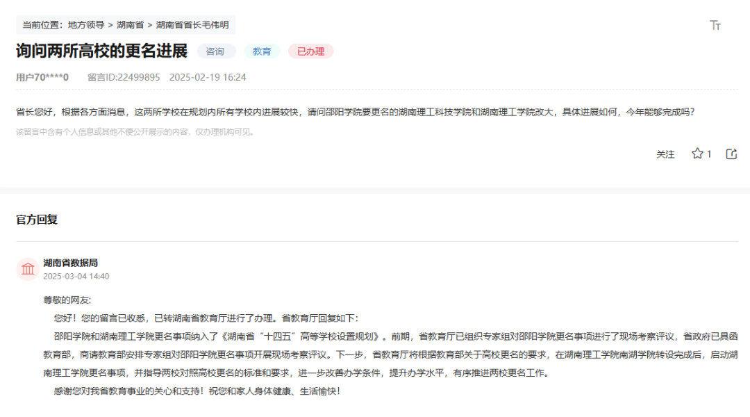 对此,湖南省数据局于3月4日回复称:邵阳学院和湖南理工学院更名事项纳入了《湖南省“十四五”高等学校设置规划》。前期,省教育厅已组织专家组对邵阳学院更名事项进行了现场考察评议,省政府已具函教育部,商请教育部安排专家组对邵阳学院更名事项开展现场考察评议。下一步,省教育厅将根据教育部关于高校更名的要求,在湖南理工学院南湖学院转设完成后,启动湖南理工学院更名事项,并指导两校对照高校更名的标准和要求,进一步改善办学条件,提升办学水平,有序推进两校更名工作。