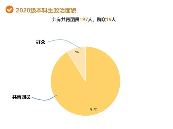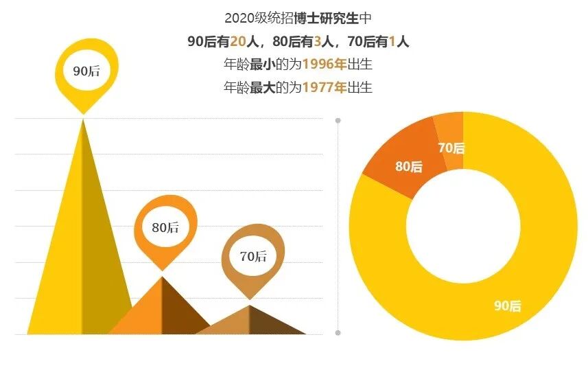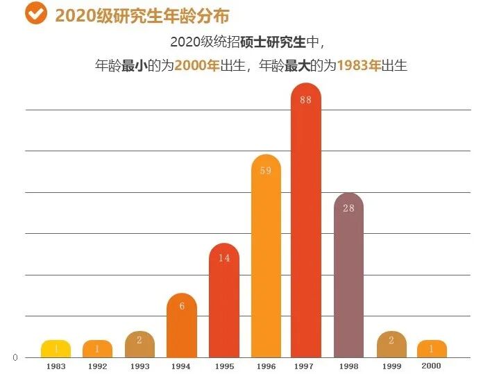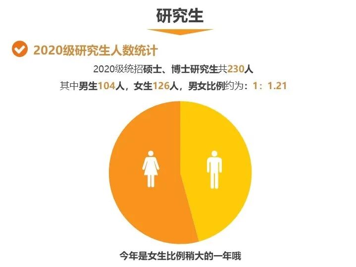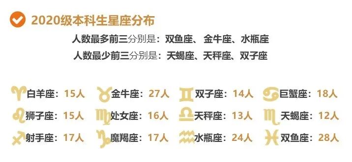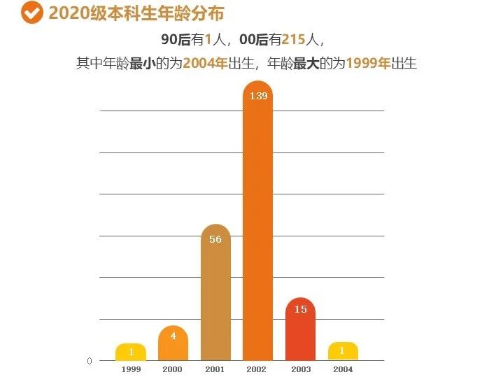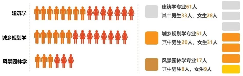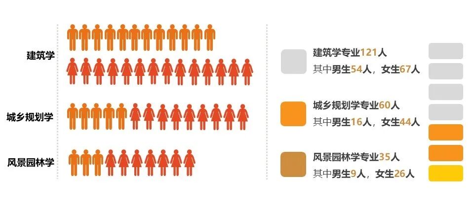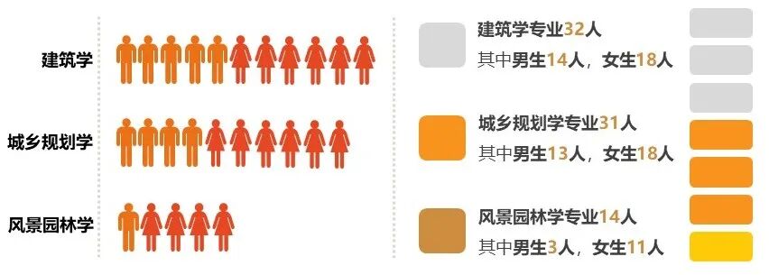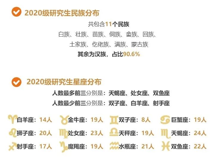 好奇的你 是否也想进一步看看新生们的整体情况? 想知道新生的男女比例如何? 热气腾腾的新生大数据全新出炉,这就奉上! 2020年9月,建筑城规学院迎来了446位同学,本科生占48.9%,硕士研究生占45.8%,博士生占5.3%。 先来看看本科生萌新,首先在整体上萌新呈现出女生多于男生的态势,男生79人,占录取人数的36.5%;女生137人,占录取人数的63.5%。那么每个专业之间有些什么不同呢?男女比最均衡的是建筑专业,大概为4:5,风景园林学专业和城乡规划专业男女比例接近1:3,男生偏少,以后有体力活的话欢迎来建筑专业借男同学! 今年本科生萌新的年龄组成是怎样的呢?从年份上看,2002年出生的小萌新是当之无愧的主力军,年纪最小的萌新今年年仅16岁,真是可敬可畏的后浪呀! 还有30组同学拥有同年同月同日生的好缘分,快来看看你的生日有没有在上面吧!也希望在重大的日子里,能认识到和你同日生的好伙伴! 另外,萌新来自最多的地方就是川渝地区,当然也吸引了从南到北、从西到东全国各地的同学,看来以后可以由川渝同学带队,组团一起去吃火锅啦! 在所有萌新中,大部分同学都是共青团员。在姓氏方面,2020级本科生萌新涵盖了将近百姓,“李王张”成为领跑姓氏。 接下来让我们看看星座方面,善解人意的双鱼座、稳定踏实的金牛座、个性十足的水瓶座人数最多,而6月、10月、11月出生的萌新则相对较少。 在216位萌新中就涵盖了6种不同的属相,其中属马的萌新是最多的,也祝愿大家都能在重庆大学本科生学习阶段马到成功! 2020年建筑城规学院收录的硕士、博士研究生共有230人,总体来说是男女比较为均衡。硕士研究生中全日制学术型硕士共77人,风景园林专业依旧具有比较大的男女比悬殊,为1:4,而城乡规划专业转而向建筑专业看齐,男女比大概为2:3;专业硕士一共129人,各个专业的男女比都较为均衡。博士生的男女比也近乎1:1。 20级硕士萌新中,1996、1997年生的同学成为主力军,年龄最小的硕士研究生今年只有20岁,最年长的硕士研究生为37岁,大家虽然在不同的年纪但都一样努力地乘风破浪。在博士研究生中,90后占多数,年龄段横跨了70、80、90后,让我们看到在不同年龄段的你们都在求知的路上勇往直前。 另外共有17组同学拥有相同的生日,希望这些难得的缘分能让刚进校的你们变得更加亲近一些。 接下来,在政治面貌方面,党员和预备党员占到29%,共青团员占比最多,达到67%。 研究生姓氏比本科生更全面,已经超越了百姓,恭喜“张陈李杨,王刘吴黄”喜提前八! 另外,从总体来看,研究生新生的民族主要还是汉族,但也包含了其他10个少数民族的同学,虽然有不同的风俗文化,但我们都是重大人、建院人。 无论是重情执着的巨蟹座,还是和蔼亲切的天秤座,都能在这届研究生中遇见,不过人数最多的还是冷静坚定的天蝎座,也许正是因为这一份坚定和执着才成为他们继续坚苦钻研的无限动力。 硕士生萌新中,小牛犊和小老鼠最多,在重庆大学建筑城规学院这个新的平台,相信你们一定“牛”气冲天、“鼠”你最强! 重大建筑城规学院 因为你们的存在 而更加朝气蓬勃、元气满满 让充满活力与热情的你们 把一腔热血和朝气化作青春路上逐梦的动力 扬帆远航