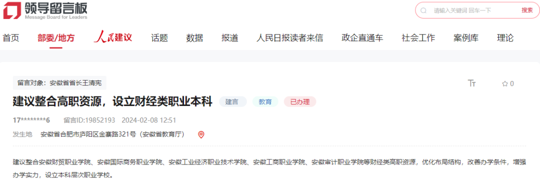 日前,有网友通过人民网领导留言板提出“建议整合安徽财贸职业学院、安徽国际商务职业学院、安徽工业经济职业技术学院、安徽工商职业学院、安徽审计职业学院等财经类高职资源,优化布局结构,改善办学条件,增强办学实力,设立本科层次职业学校。”对此,安徽省教育厅回复称:申报学校须先纳入五年高校设置规划,且本科层次职业学校的审批权在教育部,有严格的设置标准和程序要求。