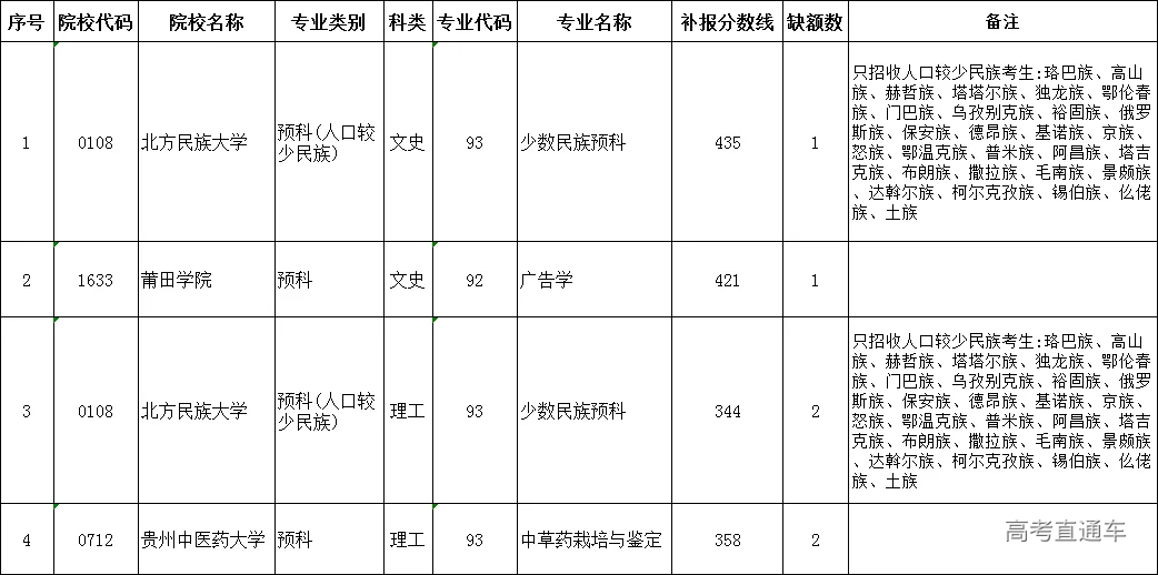 第二批本科预科补报志愿缺额数统计表