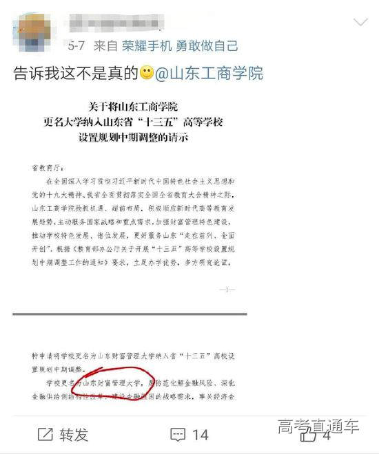 5月8日,澎湃新闻从多名山东工商学院相关人士处证实,该校已经向山东省教育厅递交申请,将学校更名山东财富管理大学的计划纳入山东省“十三五”高等学校设置规划中期调整中。