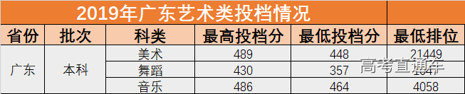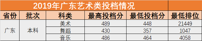 2019年7月14日,广东省本科批次艺术类录取投档,广州工商学院线上生源充足。我院各科类投档最高分与最低分见下表。