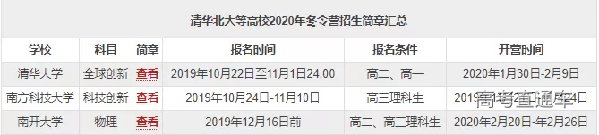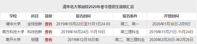 根据2019年情况,估计11月份有一大批高校发布冬令营简章,比如:北大有寒假学堂、人文寒假课堂、化学寒假课堂等;清华有人文与社科冬令营、科学与工程挑战赛、化学前沿体验营等;复旦数学竞赛决赛(冬令营);上交大致远科营;国科大学科冬令营、天大工程科学冬令营等等。