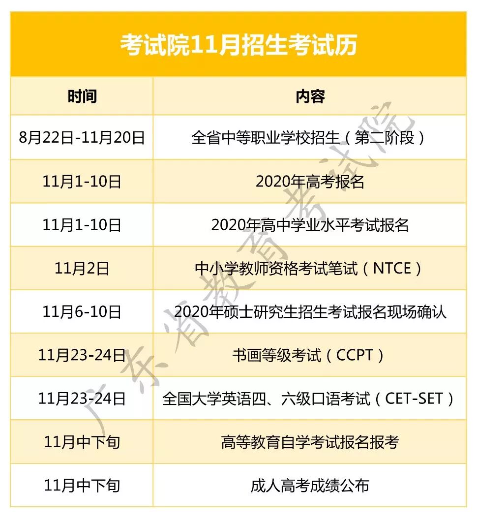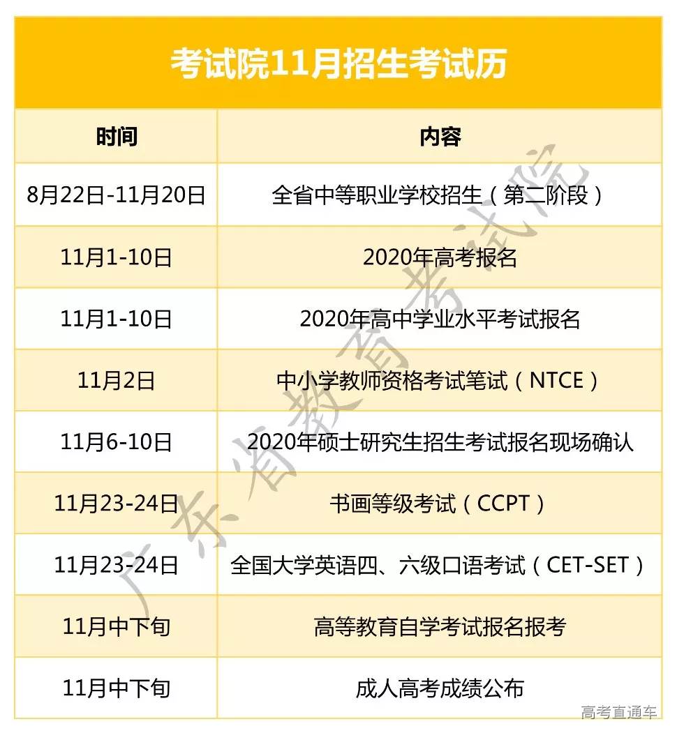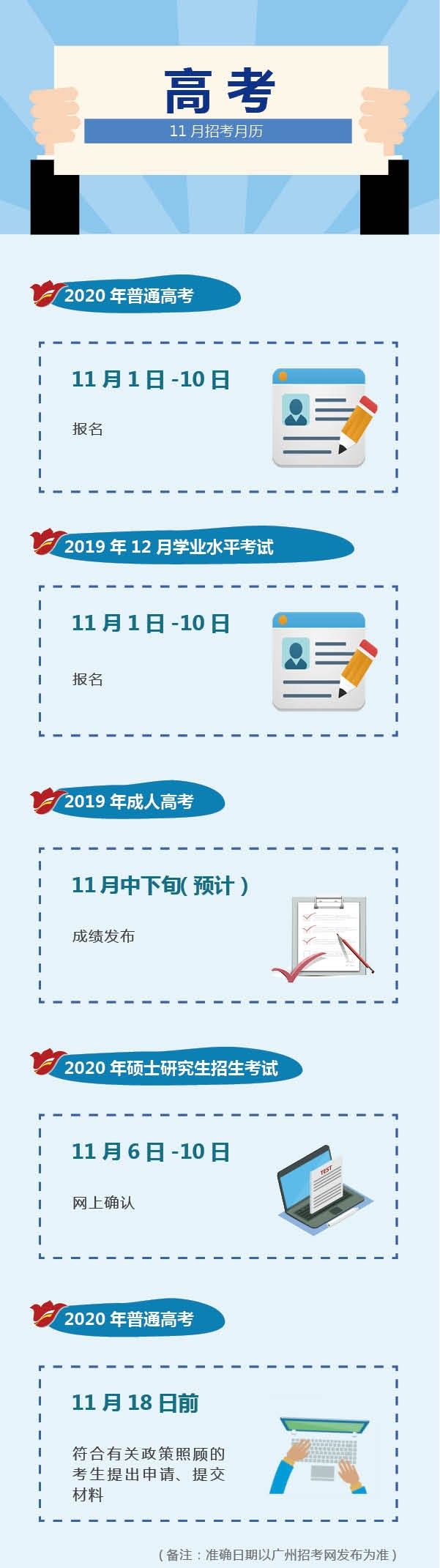 告别金秋十月,我们迎来了11月。这个月有哪些高考大事件呢?高考直通车(ID:gkztcwx)为大家整理了全国各省市11月的招考月历,赶紧来看看吧~