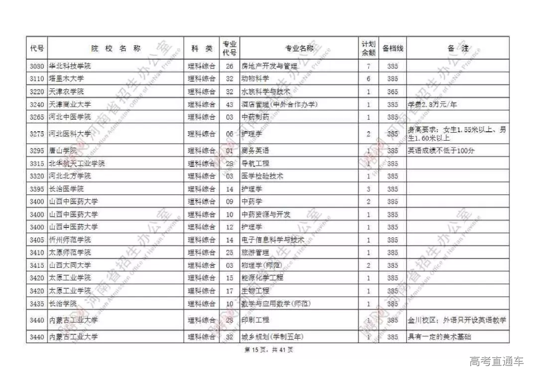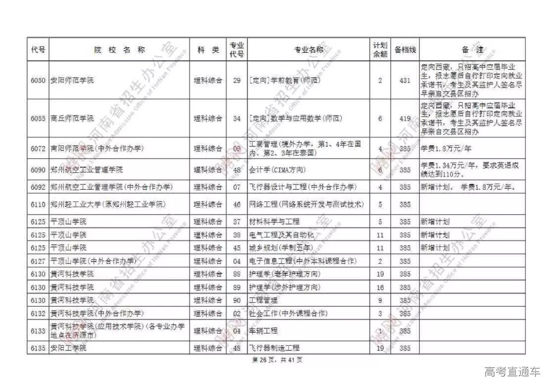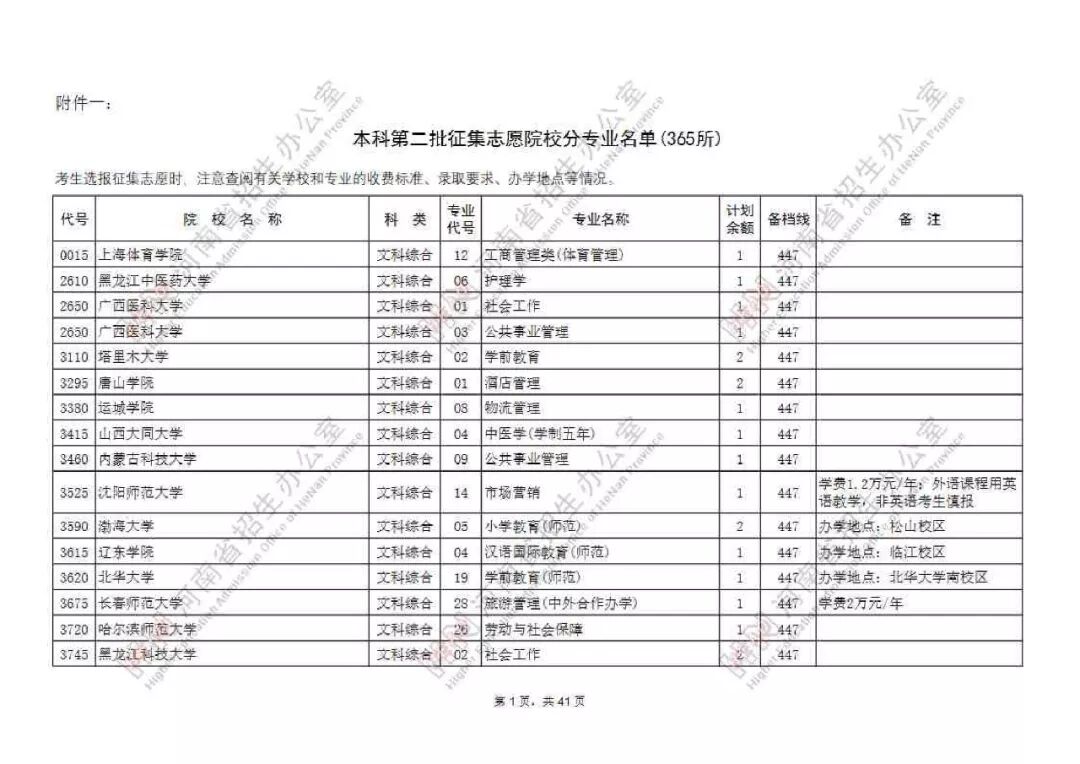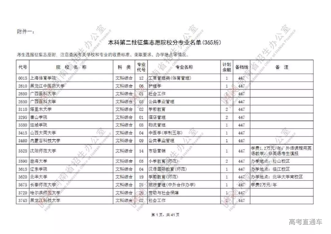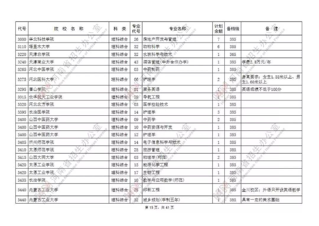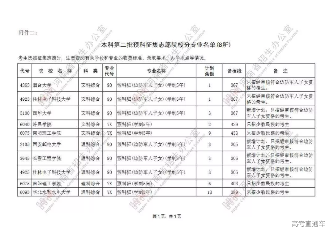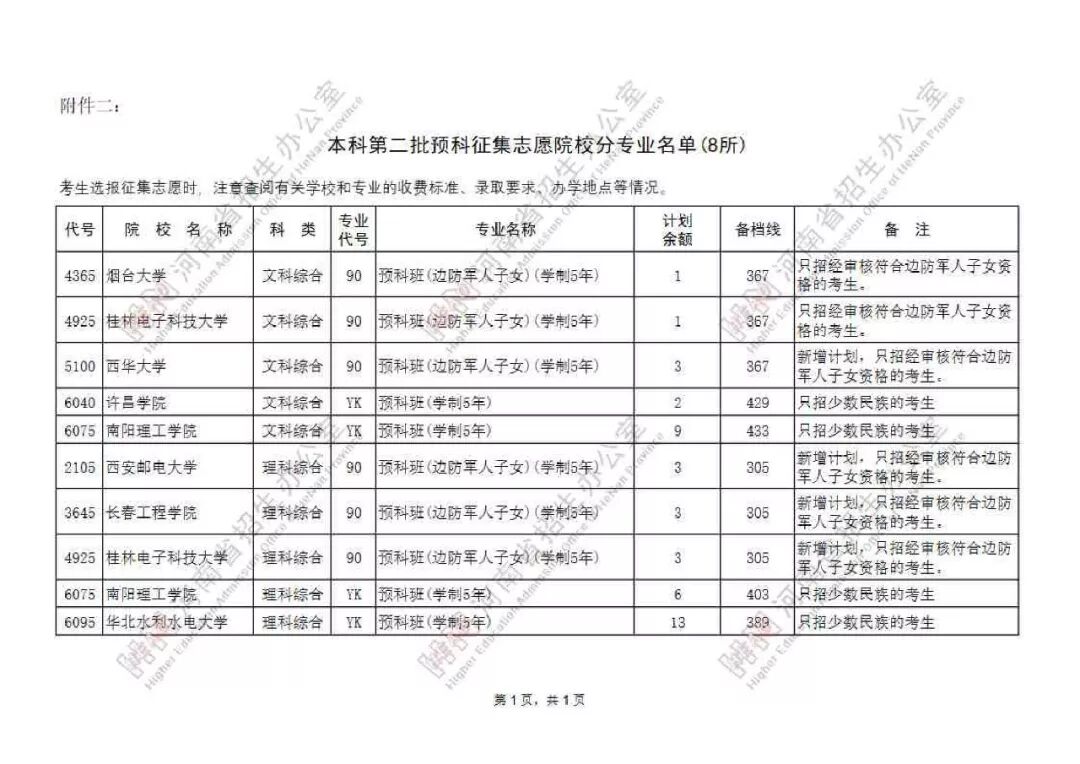 各省辖市招办,省直管县(市)招办,各有关院校: 一、生源范围 凡高考文化成绩达到省定相应批次分数线或备档线,且符合相应批次生源条件,当前未被录取的考生,可补报征集志愿的院校。 二、网上填报征集志愿办法 (一)征集志愿实行网上填报方式。拟选报征集志愿的考生,须于7月30日18:00之前登录河南省招生办公室网站(http://www.heao.gov.cn)查阅相关信息,凭本人帐号和密码登录“河南省普通高校招生考生服务平台”(https://pzwb.heao.gov.cn)查看本人档案运转状态,进入填报志愿界面,按照规定程序和时间完成网上志愿填报操作。逾期网上填报系统关闭,考生将无法再进行任何填报操作。 三、加强指导和服务工作 征集志愿是我省招生工作的既定程序,是完成招生计划、满足考生升学要求的重要措施。各市、县招办要高度重视,加强宣传,认真做好咨询指导,安排专人网上在线解答考生咨询问题。同时,在招生服务大厅为不具备上网条件的考生提供必要的上网填报志愿条件及咨询服务。 本科二批征集志愿院校分专业名单(365所) (可点击图片放大查看) 本科二批预科班征集志愿院校分专业名单(8所)