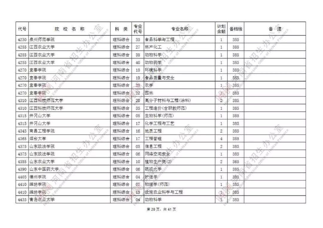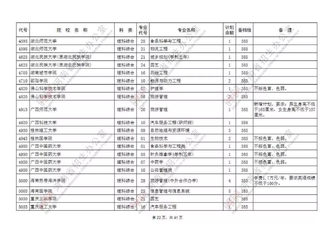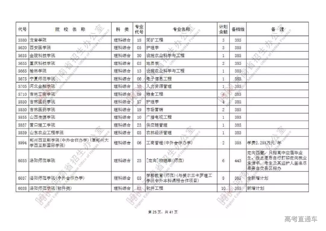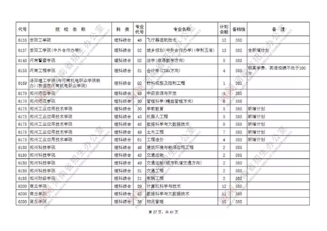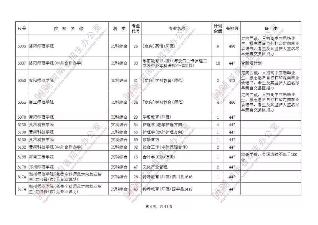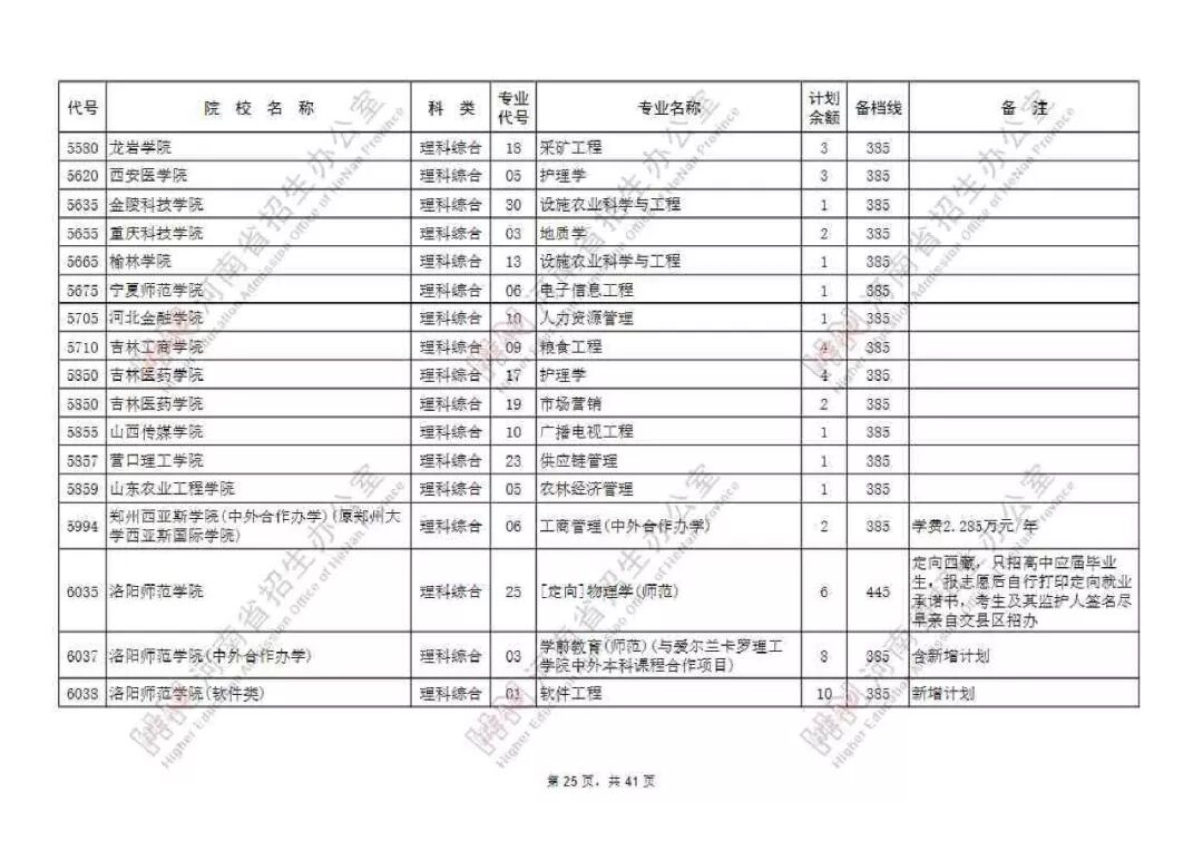 各省辖市招办,省直管县(市)招办,各有关院校: 一、生源范围 凡高考文化成绩达到省定相应批次分数线或备档线,且符合相应批次生源条件,当前未被录取的考生,可补报征集志愿的院校。 二、网上填报征集志愿办法 (一)征集志愿实行网上填报方式。拟选报征集志愿的考生,须于7月30日18:00之前登录河南省招生办公室网站(http://www.heao.gov.cn)查阅相关信息,凭本人帐号和密码登录“河南省普通高校招生考生服务平台”(https://pzwb.heao.gov.cn)查看本人档案运转状态,进入填报志愿界面,按照规定程序和时间完成网上志愿填报操作。逾期网上填报系统关闭,考生将无法再进行任何填报操作。 三、加强指导和服务工作 征集志愿是我省招生工作的既定程序,是完成招生计划、满足考生升学要求的重要措施。各市、县招办要高度重视,加强宣传,认真做好咨询指导,安排专人网上在线解答考生咨询问题。同时,在招生服务大厅为不具备上网条件的考生提供必要的上网填报志愿条件及咨询服务。 本科二批征集志愿院校分专业名单(365所) (可点击图片放大查看) 本科二批预科班征集志愿院校分专业名单(8所)