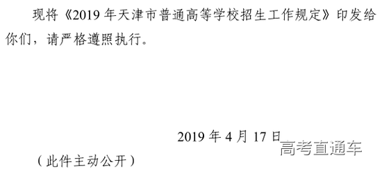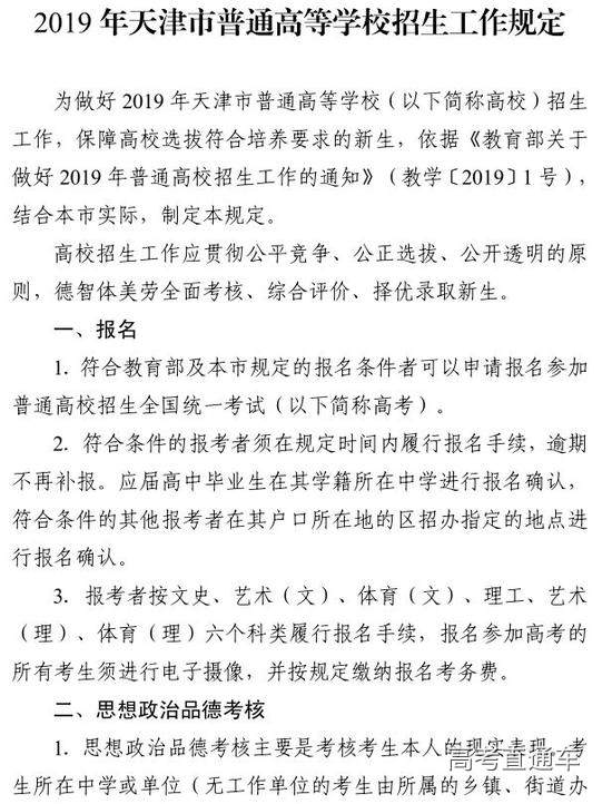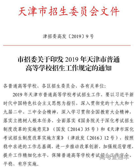 《市招委关于印发2019年天津市普通高等学校招生工作规定的通知》发布,市教委就天津高招报名、思想政治品德考核、身体健康状况检查、考试、招生章程、填报志愿、考生档案、录取等方面做出了详细解读,具体文件如下: