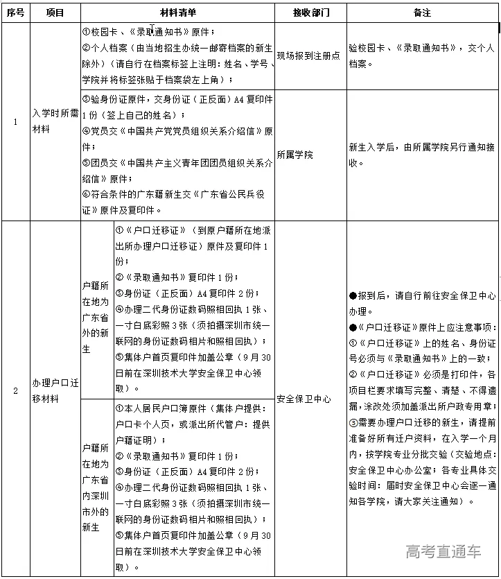 ●新生凭《录取通知书》到当地市(县)招生办或毕业中学办理调转《中学学籍档案》手续,并将档案送往深圳技术大学国际合作与学生工作部,可通过以下途径送达: