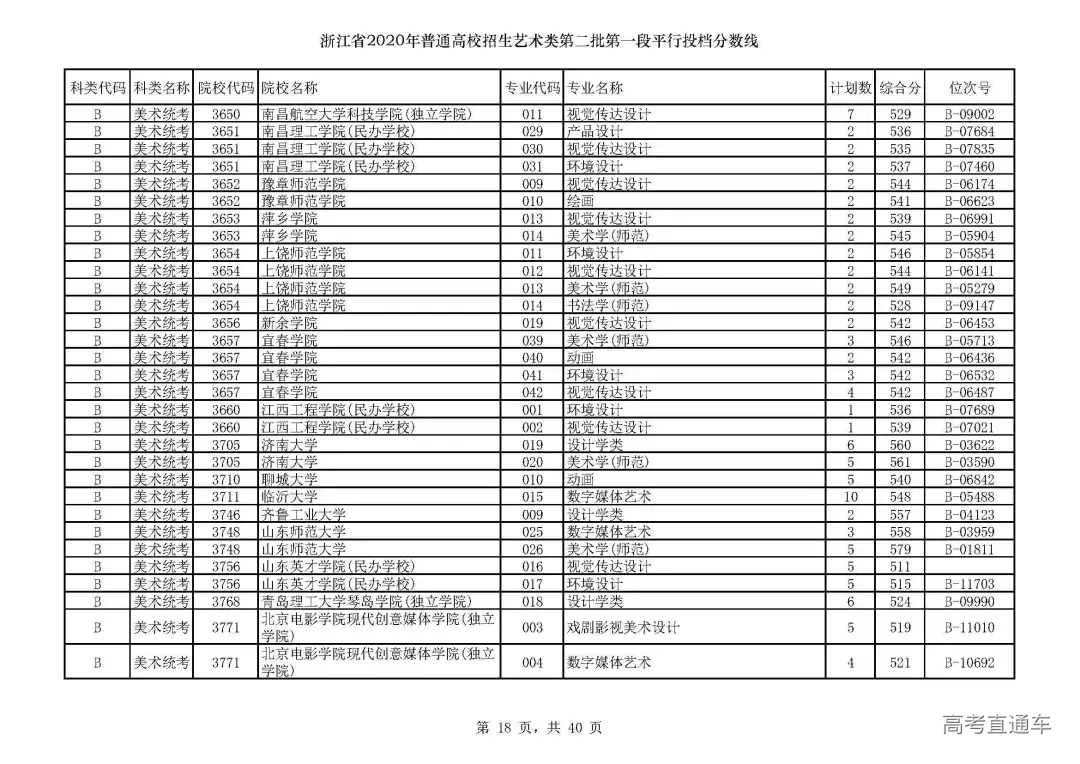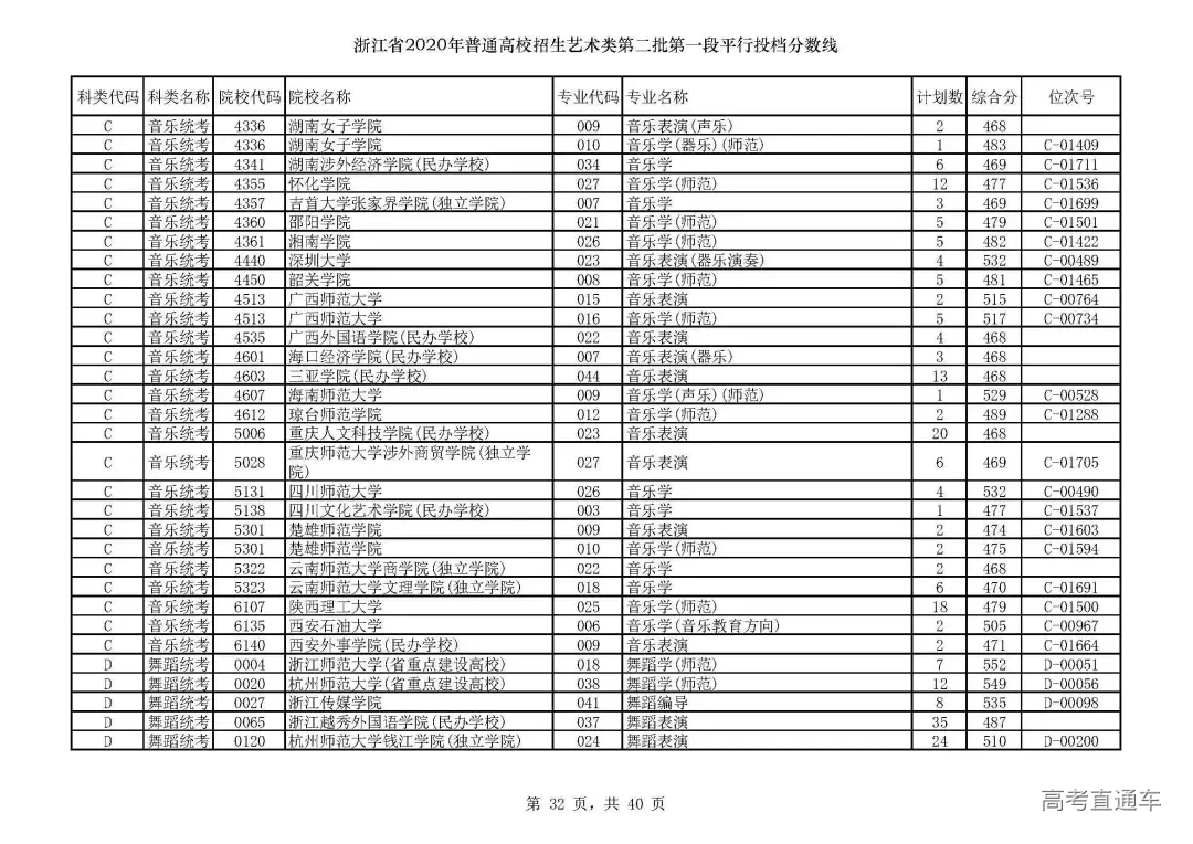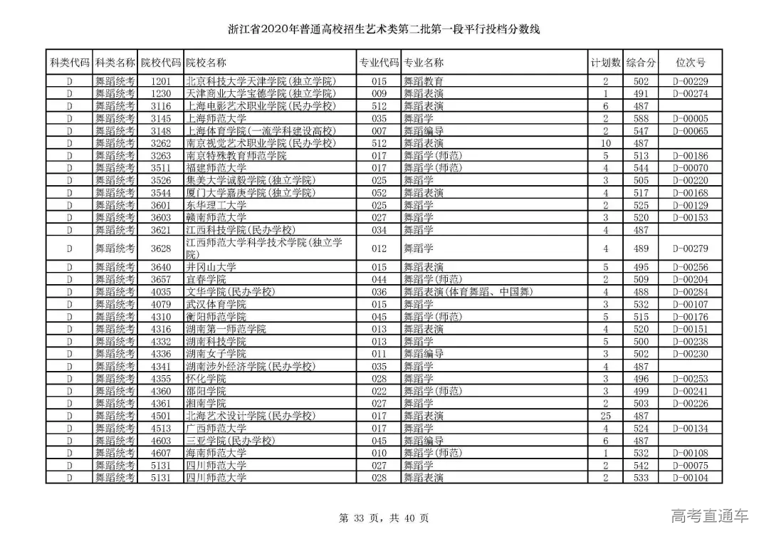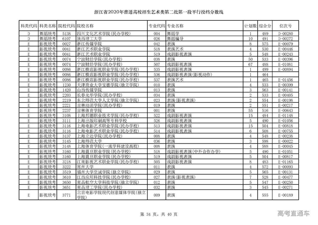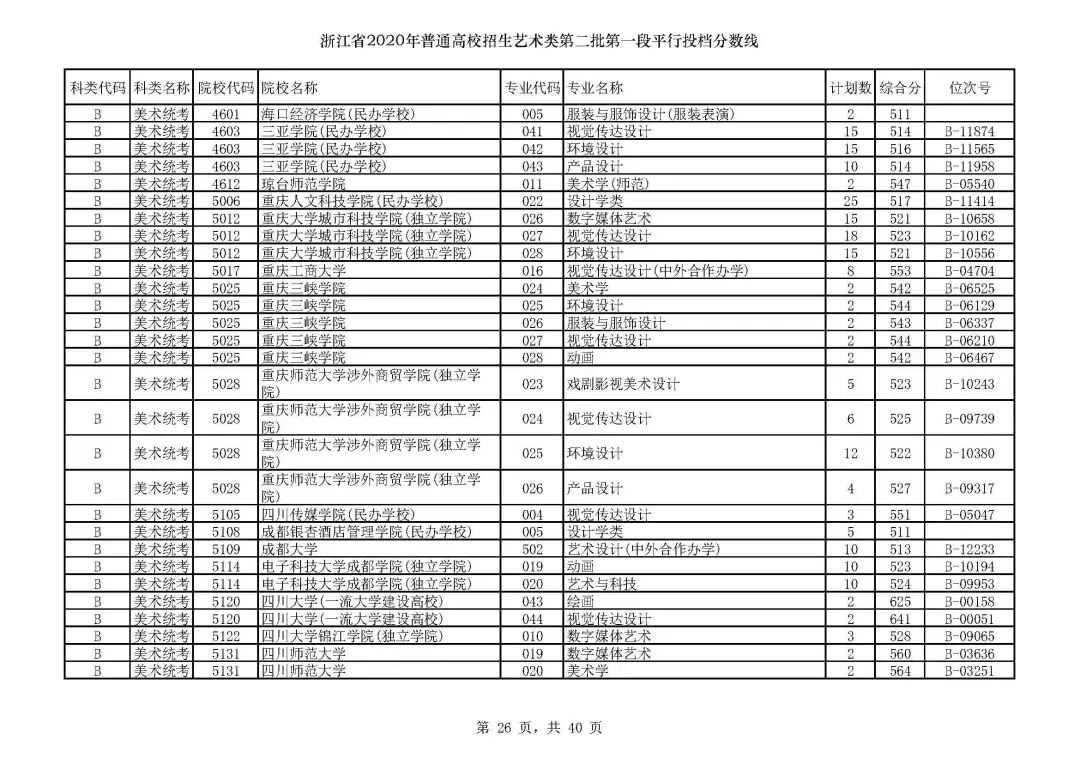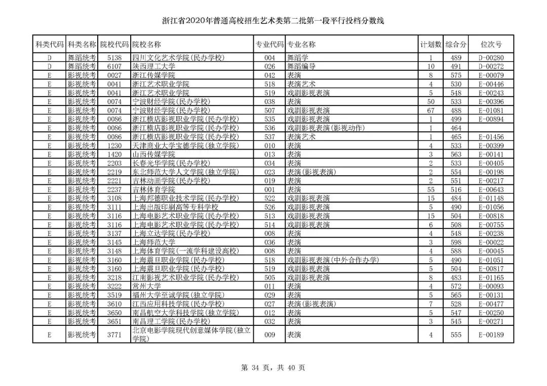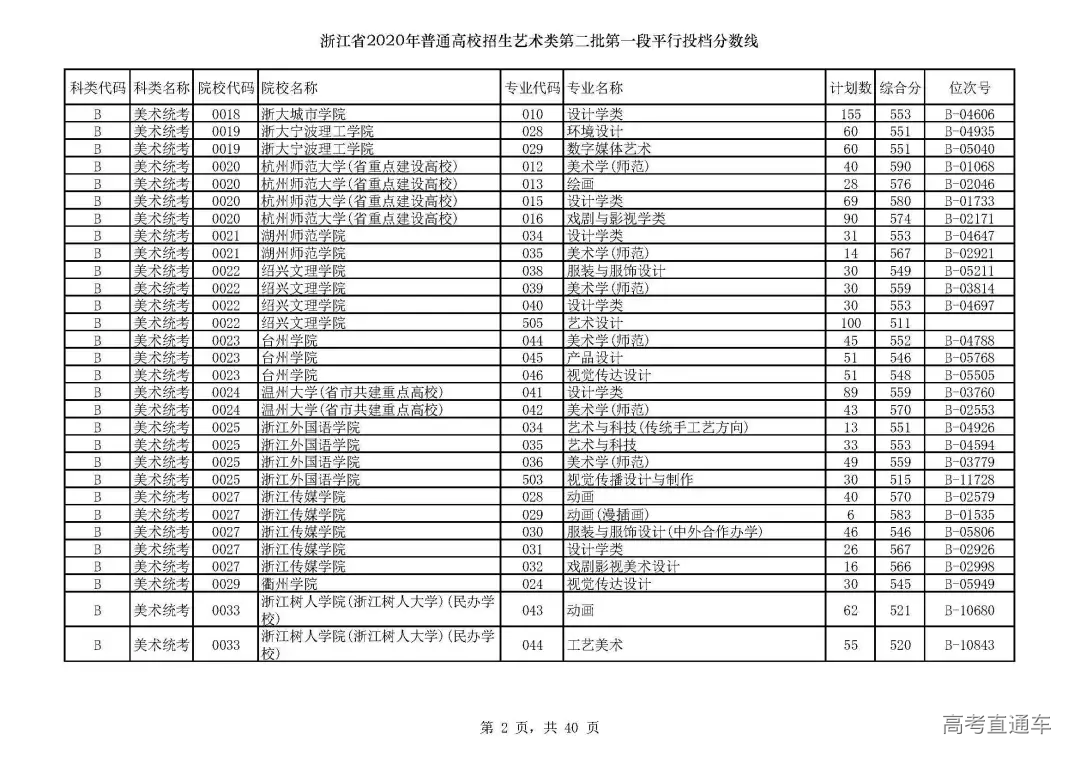 浙江省2020年艺术类第二批第一段平行投档分数线