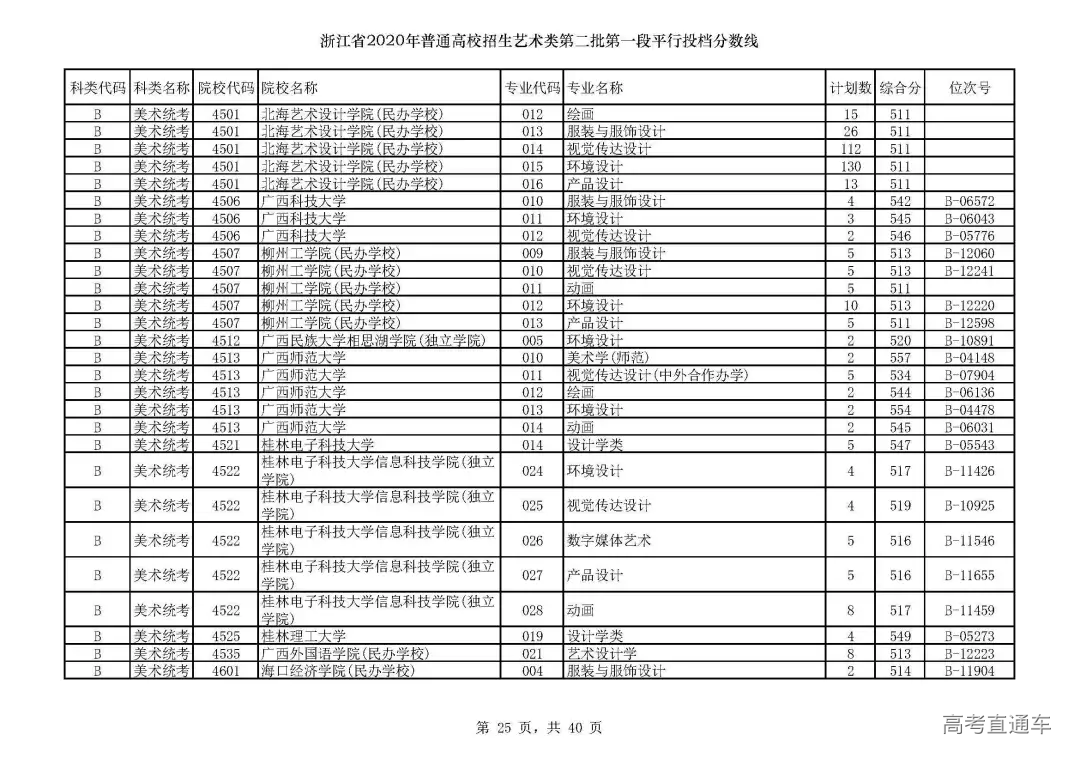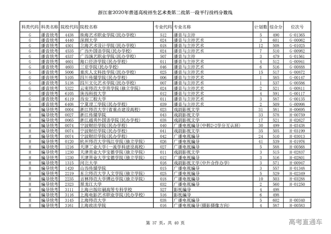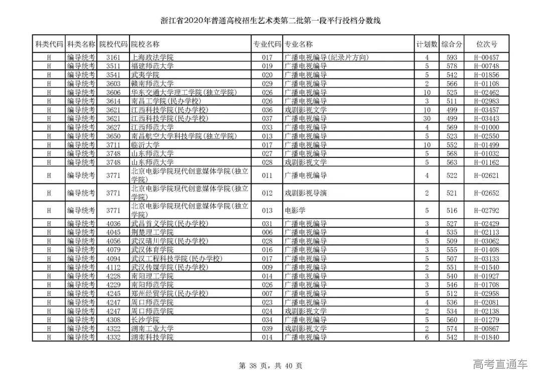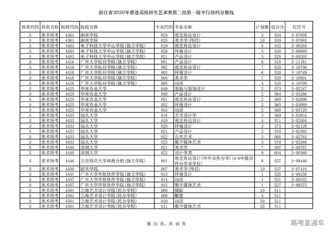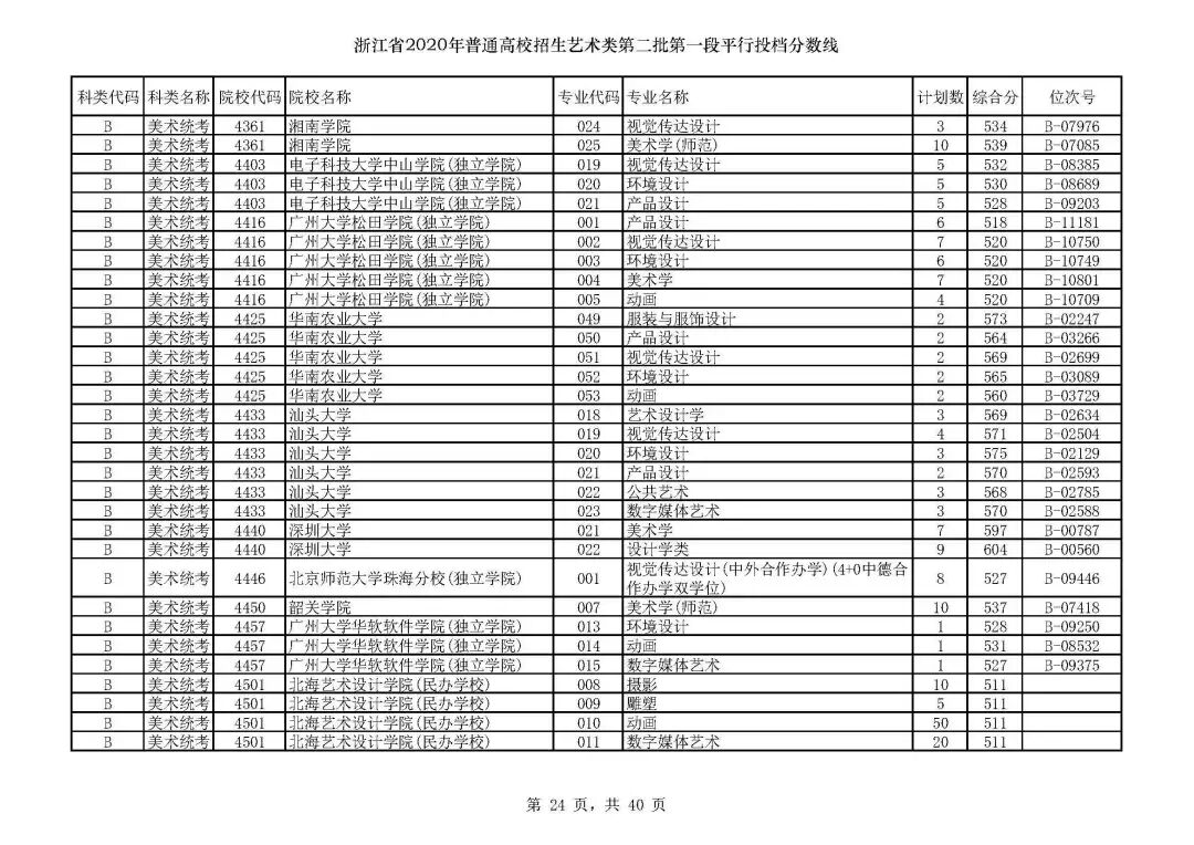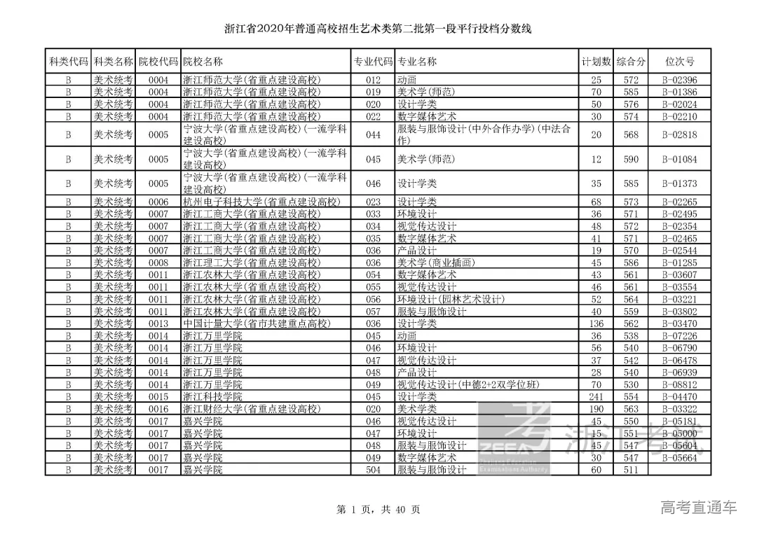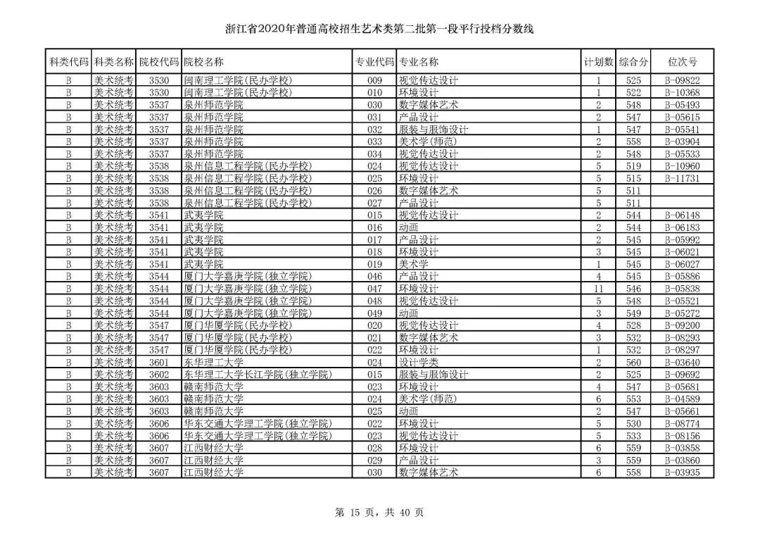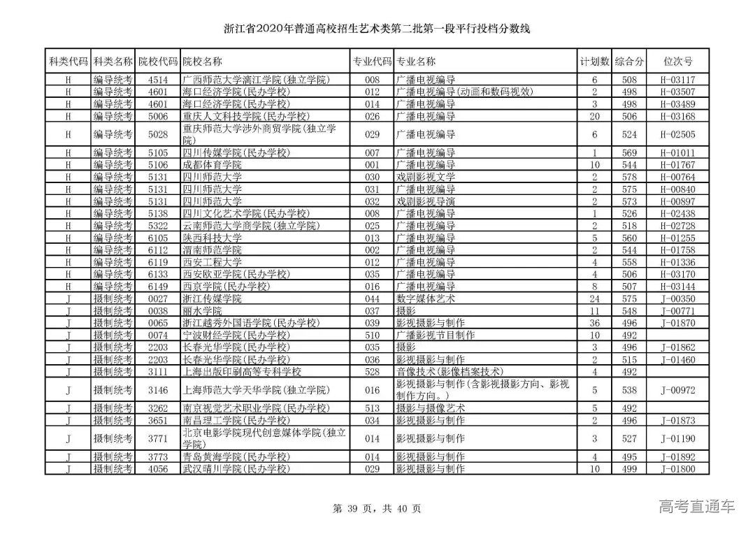 浙江省2020年艺术类第二批第一段平行投档分数线